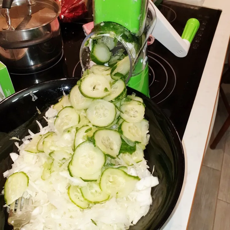 【Сохраните свое время 】: Измельчитель овощей более эффективен с минимальными усилиями, используя эту терку для сыра. Вращение 1 круга означает резку 12 раз. Более прочный и быстрый.