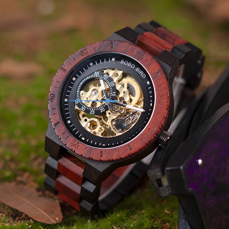 Бренд: BOBO BIRD Автоматические механические часы Пол: мужчины Модель: GR005-2 Цвет: красный Стиль: Модный, роскошный Механизм: механический механизм Вес: 80 г Периметр: 230 мм Водонепроницаемый для деталей