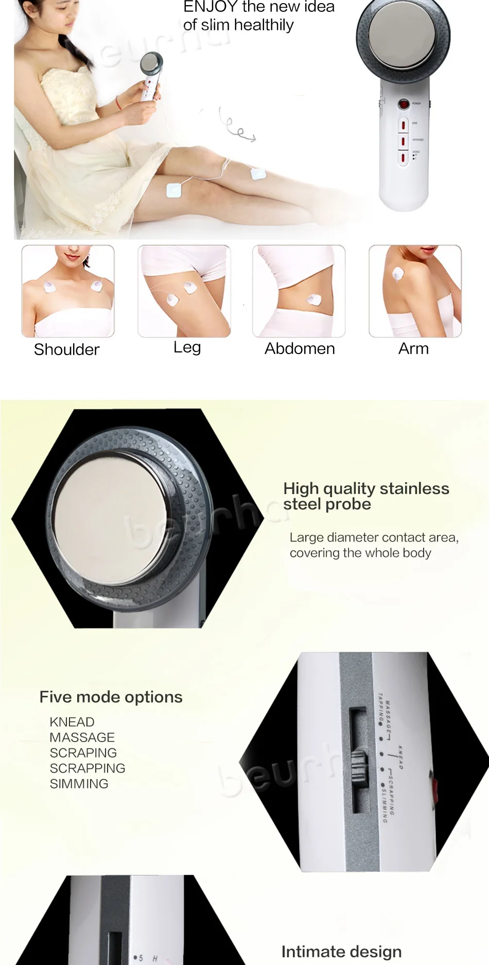 Инфракрасный луч может более тщательно восстановить эластичность и активность клеток.Быстро и эффективно уменьшает и избавляет от тяжелых хронических болей в спине, других видов боли в телеУлучшает текстуру кожи, против морщин, помогает бороться с жировыми участками, подтягивает.С постукиванием, массажем, разминанием, скраппингом, похудением 5 режимов для различных потребностей.Выбор 5 интенсивности, свободно выбирайте один, чтобы вы чувствовали себя комфортно Описание:Регулируйте внутреннюю секрецию и ускоряйте употребление жира, воплощайте мечты о похудении.Эффективный ультразвуковой массажер для лица и тела.Мини и стильный внешний вид, удобно носить с собой, прост в использовании. Характеристики:Источник питания: 100-1240 вВыходная частота: 50-60 ГцПотребляемая мощность: 12 ВтМатериал: пластик, металлРазмеры: 19x8x6cmЦвет: белый и черныйТип вилки: USPlug , EU Plug, UK Plug, AU Plug Посылка включает в себя:1 x массажер1 х адаптер питания1 х кабель2 пары контактных подушечек1 x Руководство пользователя Примечания:1. Из-за разницы между различными мониторами изображение может не отражать фактический цвет изделия. Мы гарантируем, что модель реального изделия не отличается от представленной на фото.2. Из-за ручного измерения и различных методов измерения, пожалуйста, допускайте отклонение на 1-3 см. Спасибо!