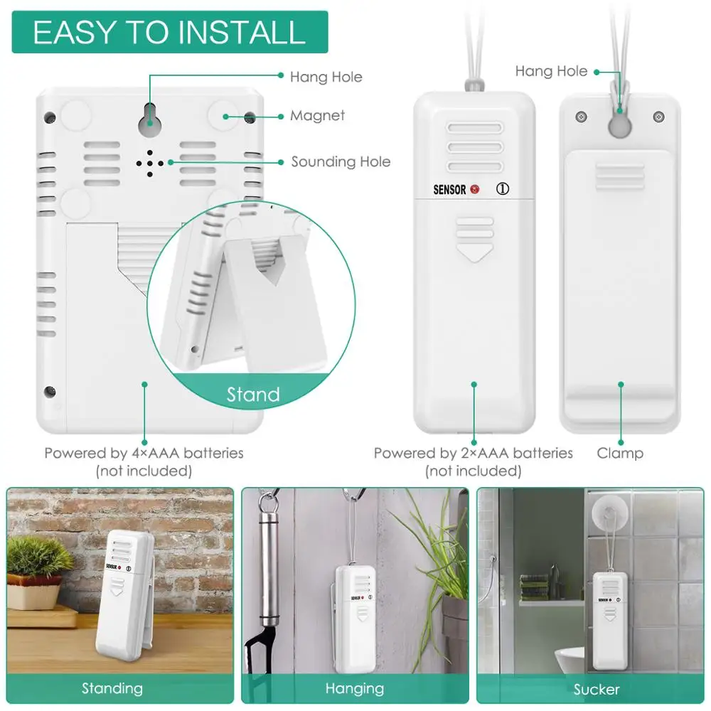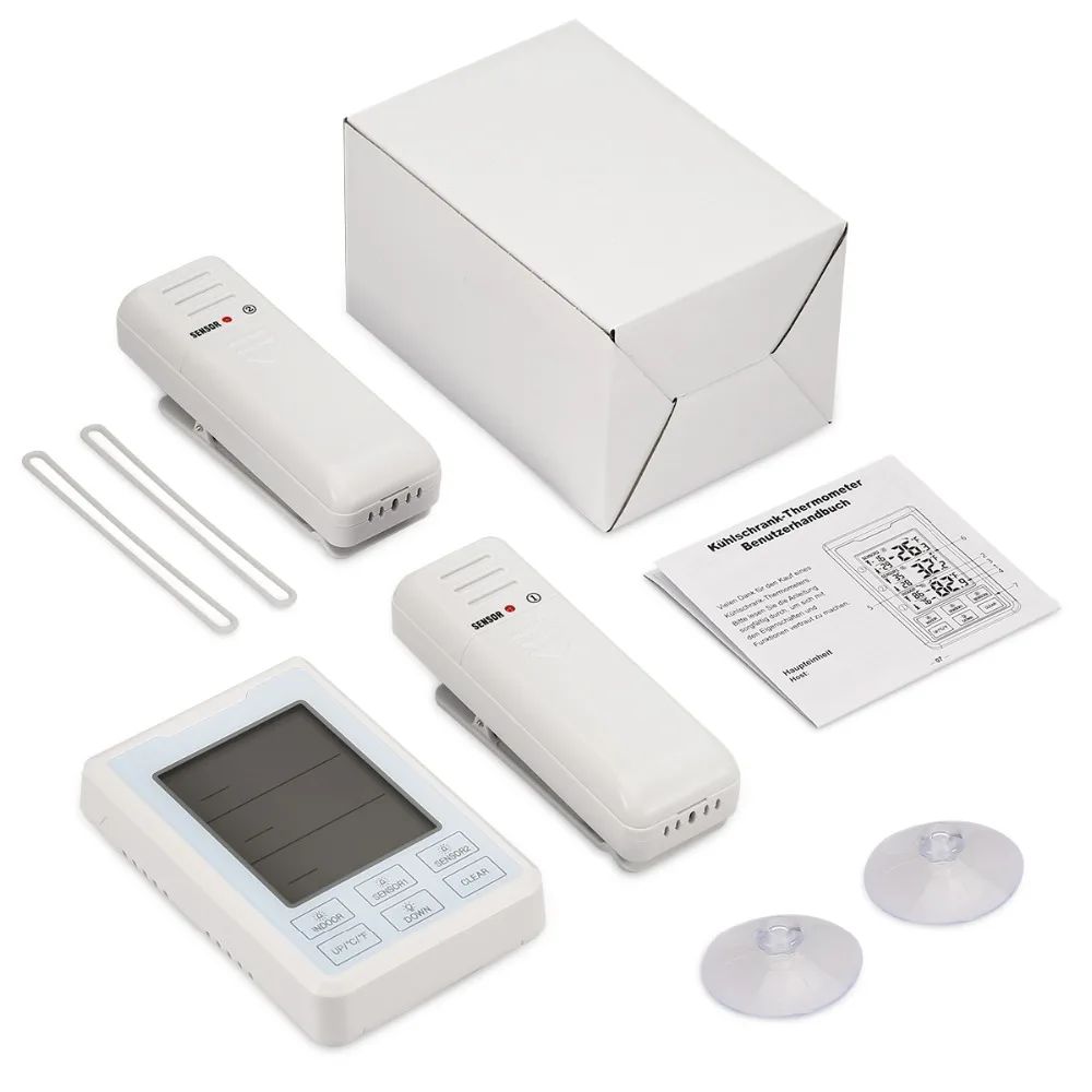 【Installtion】 Многофункциональные Силиконовые сенсорные ремни можно использовать с прилагаемыми присосками или обернуть вокруг проволочной полки холодильника или морозильной камеры. Со встроенными магнитами, подвесным отверстием и кронштейном сзади, вы можете поместить основной блок в дверь холодильника, повесить на стену или стоять на столе.