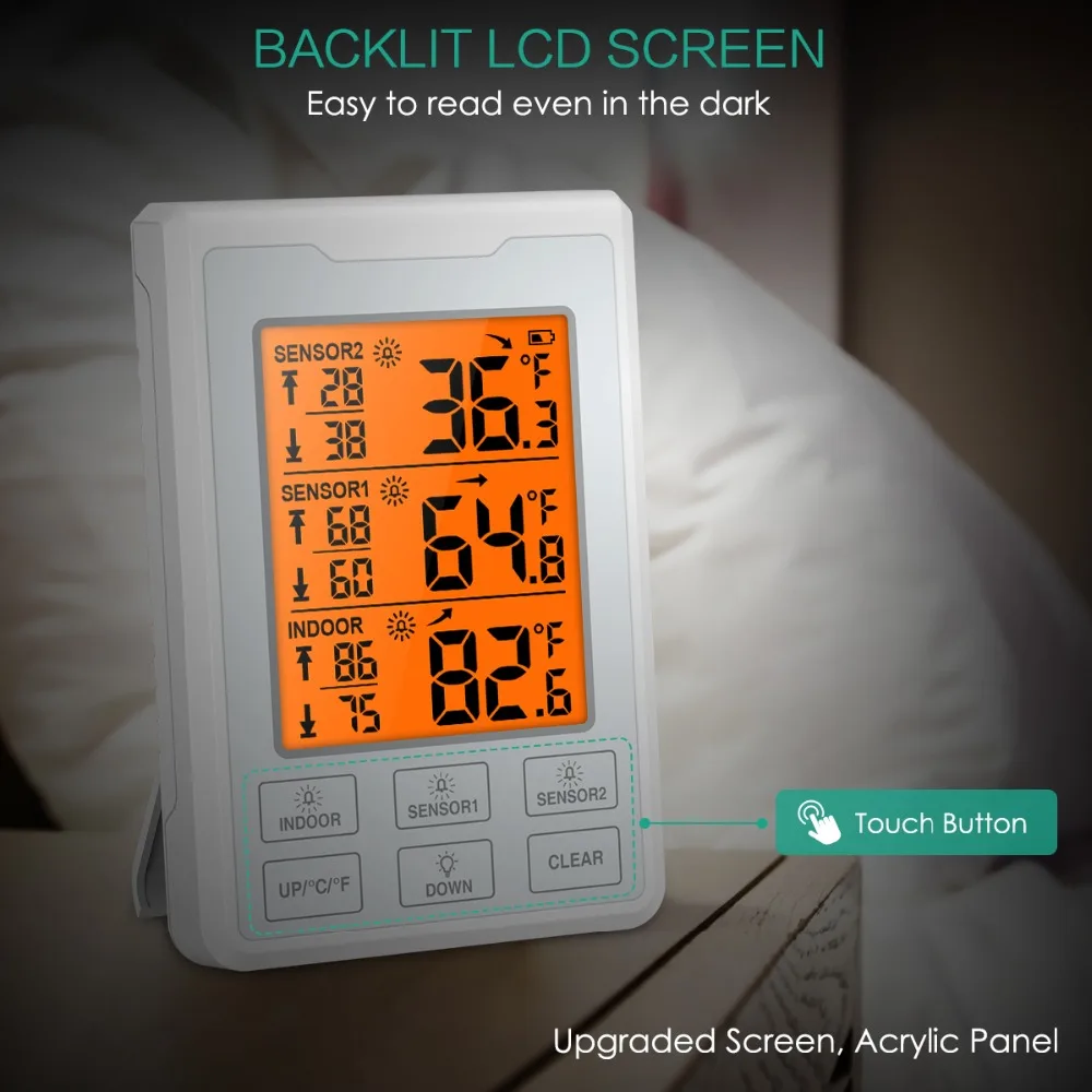 【Температурный диапазон: Внутренний/наружный Диапазон термометра: Внутренний-10 ℃ ~ 60 ℃ (14 ℉ ~ 140 ℉), наружный-40 ℃ ~ 60 ℃ (-40 ℉ ~ 140 ℉), дальность передачи составляет 100 м/328фт (открытая площадь). Используйте его в холодильнике, морозильной камере или на открытом воздухе, что обеспечивает безопасное хранение продуктов.