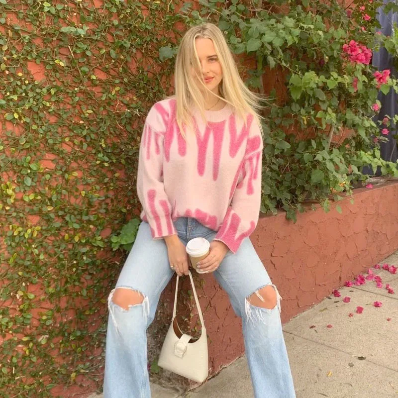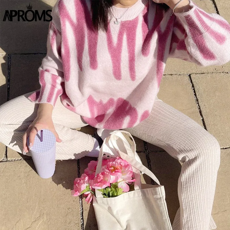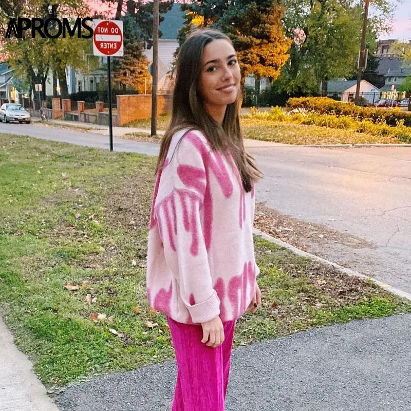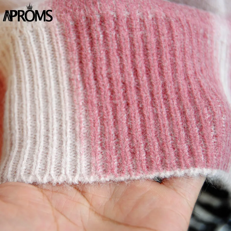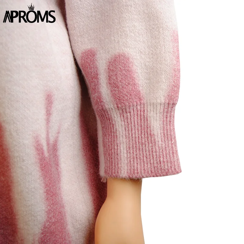 Aproms элегантный корейский модный розовый полосатый принт длинный свитер для женщин 2022 зимняя уличная одежда розовый вязаный пуловер Свободная верхняя одежда