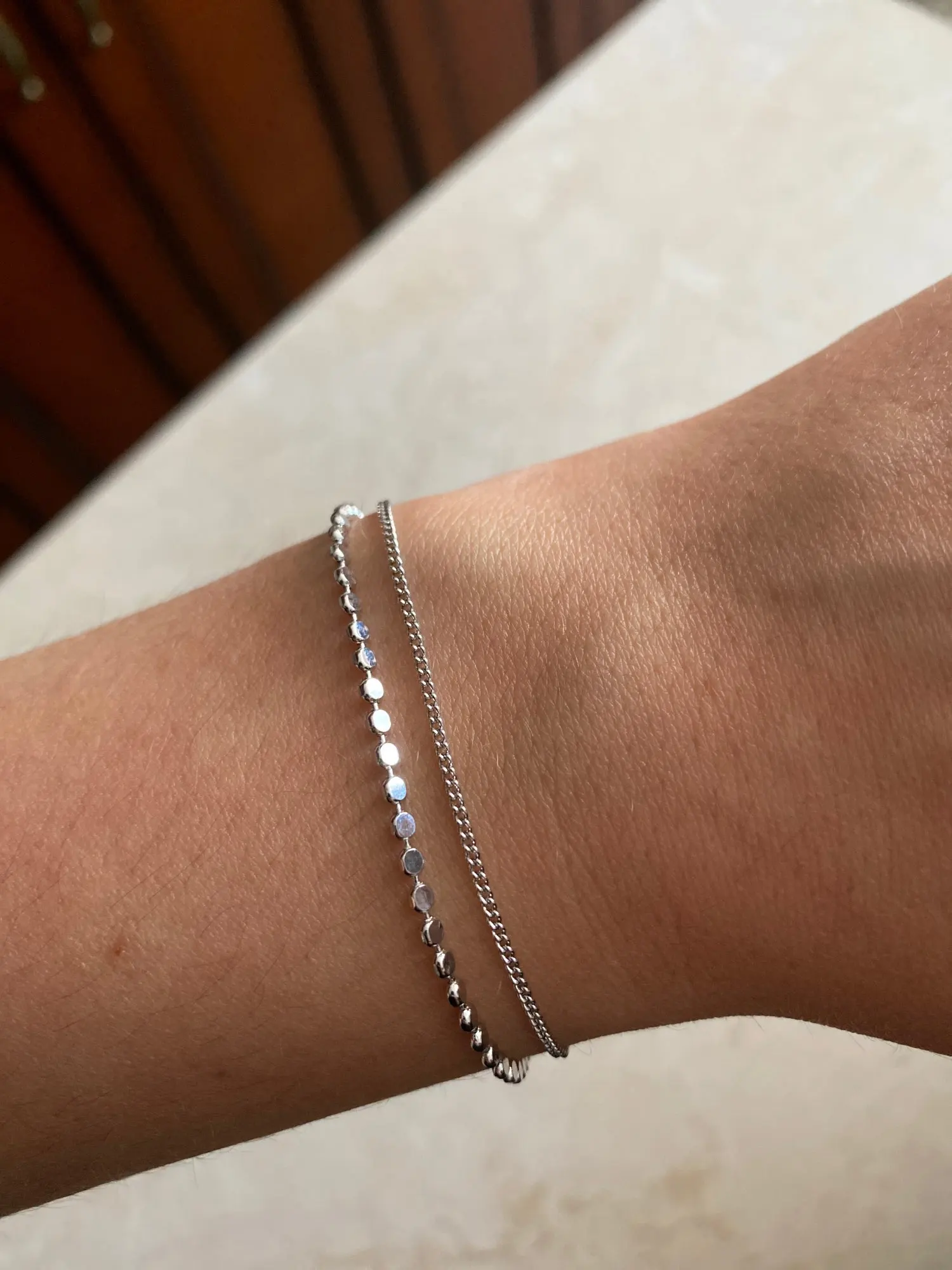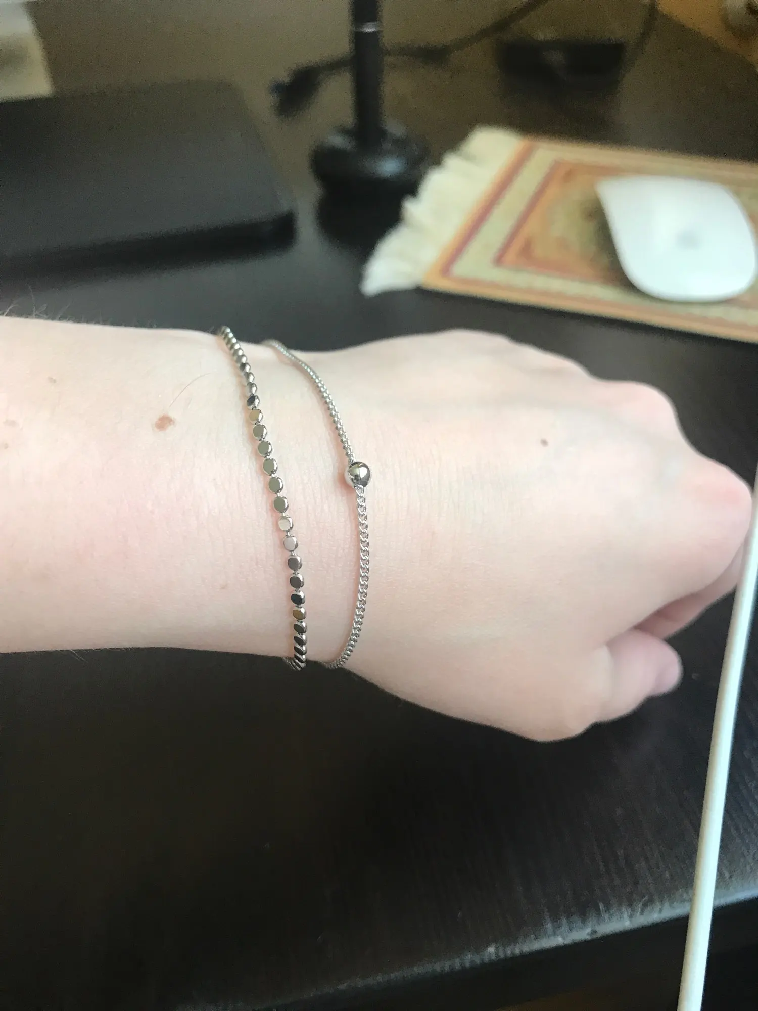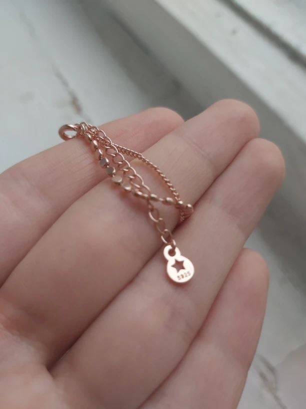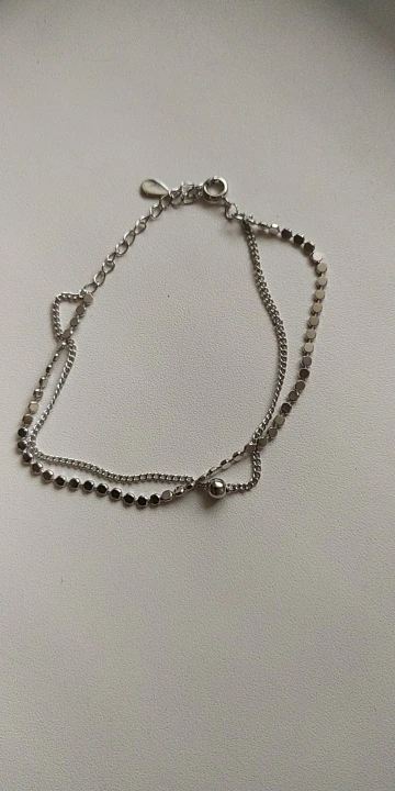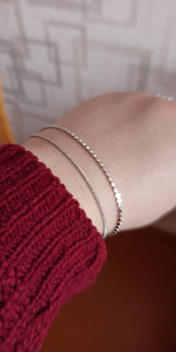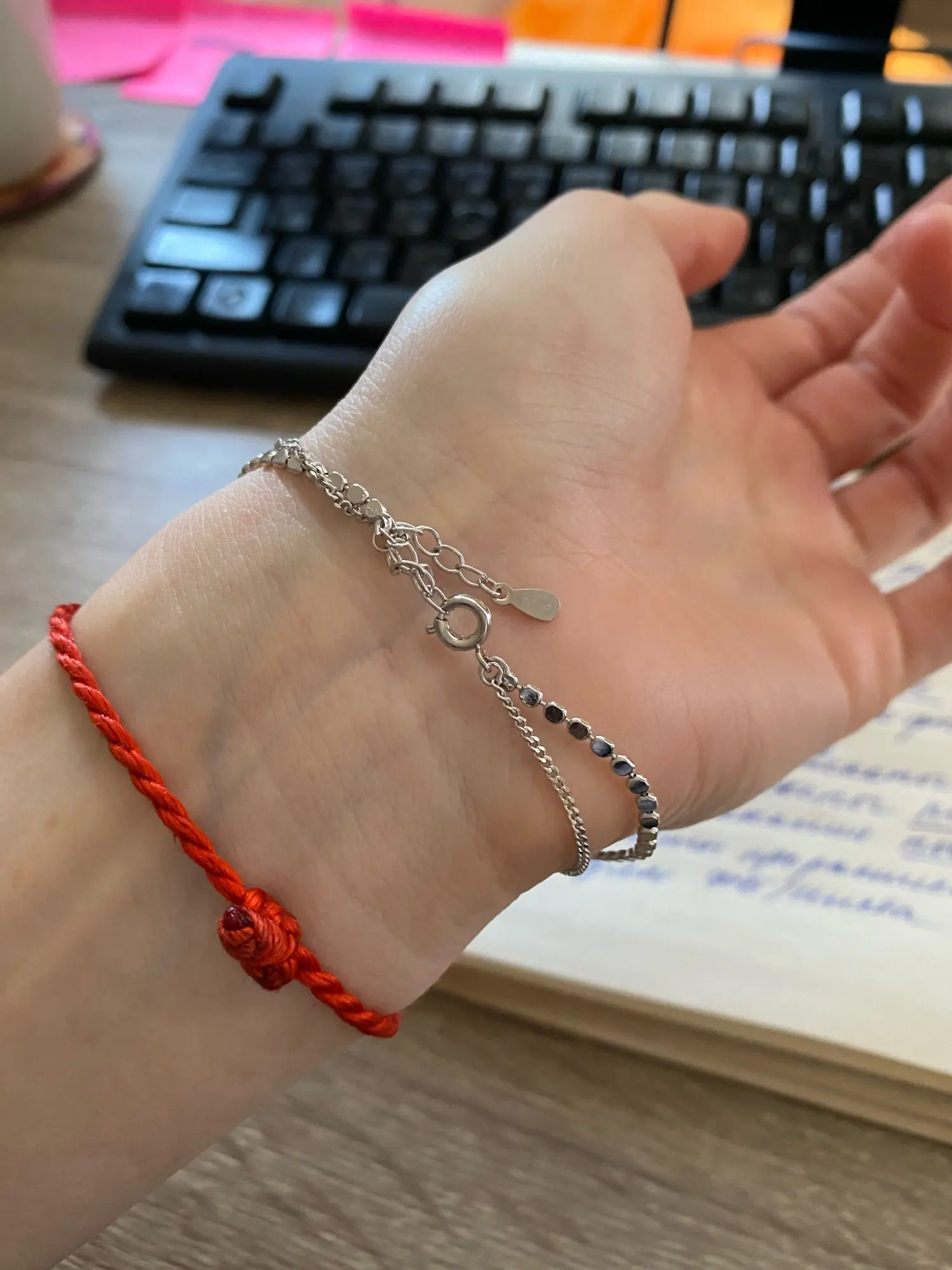 Шикарный браслетик! Доставка быстрая. Свисающий хвостик отрезала - мешается. Ношу браслет на повседневной основе - всё отлично! Покрытие не слезло, возможно действительно серебро. Центральная бусинка припаяна к цепочке и соответсвенно она не «гуляет» по браслету. Спасибо!