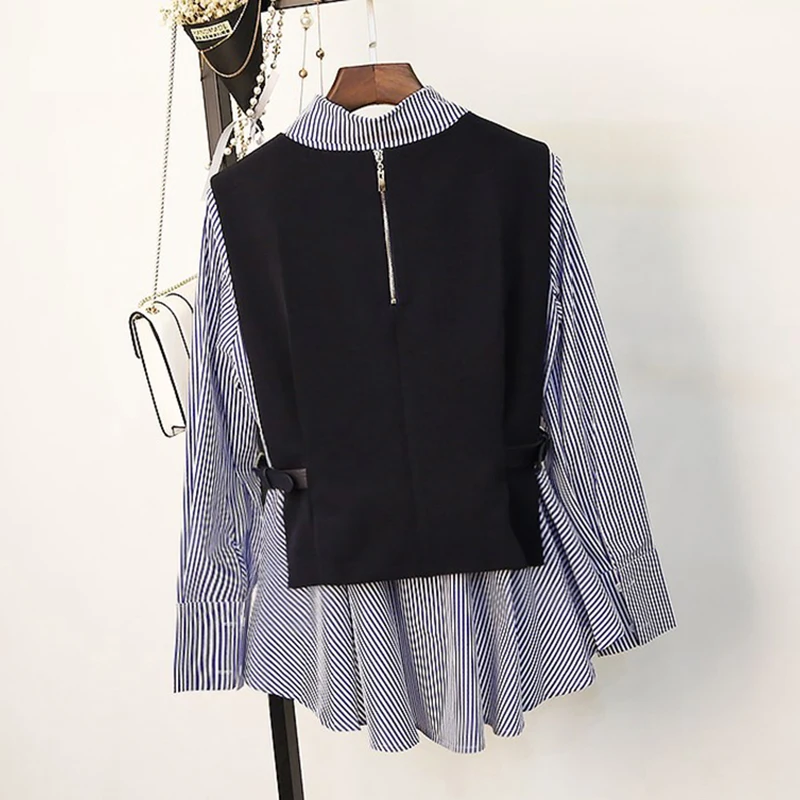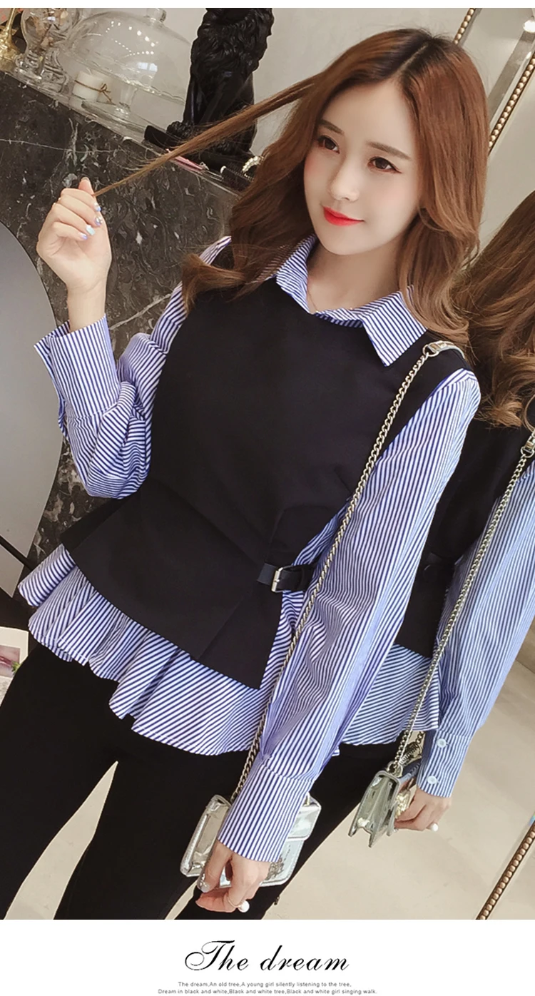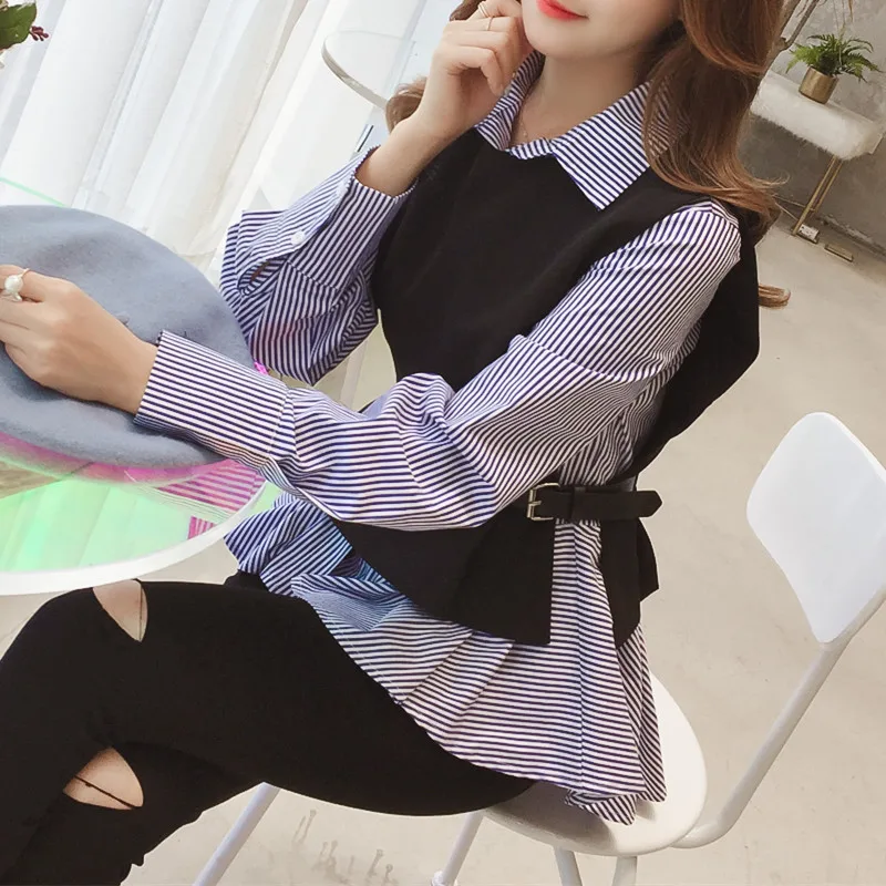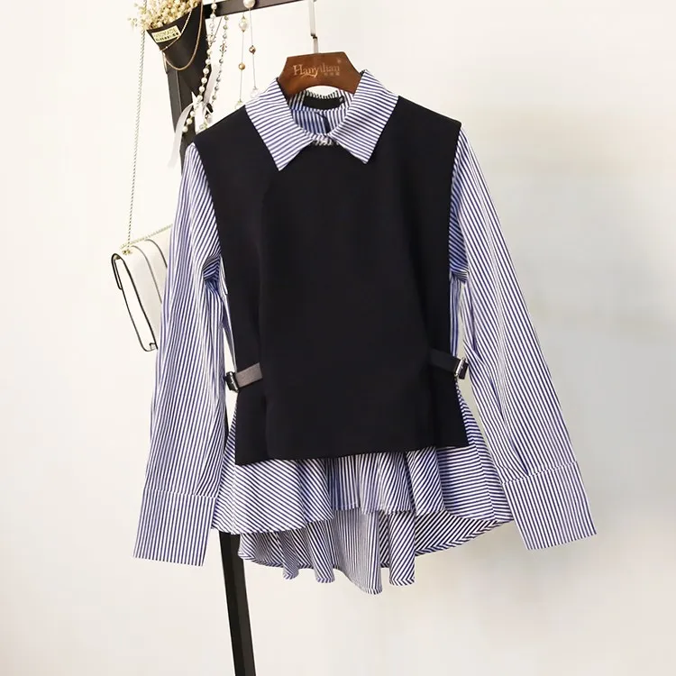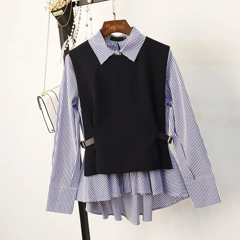 Блузка женская из двух частей, жилет с длинным рукавом и блузка в Корейском стиле, рубашка в полоску с размера плюс, топ на весну-осень
