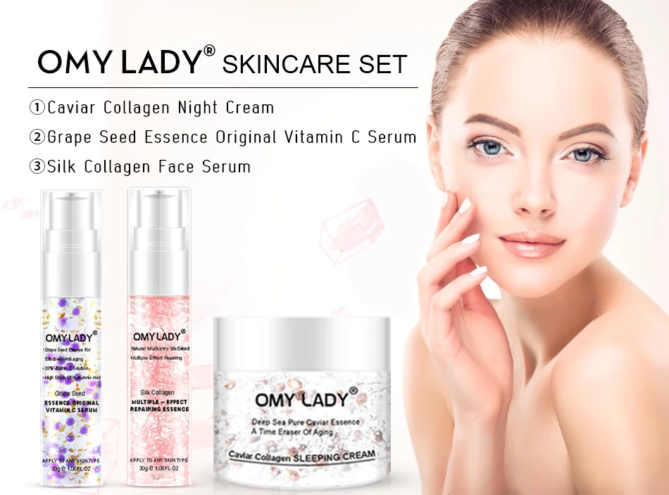 OMYLADY шелковая коллагеновая Сыворотка для лица + эссенция виноградных косточек, оригинальный витамин С, сыворотка + Икра, коллаген, ночной крем, набор по уходу за кожей