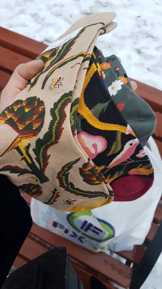 Хорошие носки: по качеству претензий нет, приятные на ощупь. Принт необычный и приковывающий внимание. Выдержали стирку достойно. Скатались совсем немного. Размер не уменьшился. Незамеченной в таких носках не отстанешься. Доставили за 3 недели
