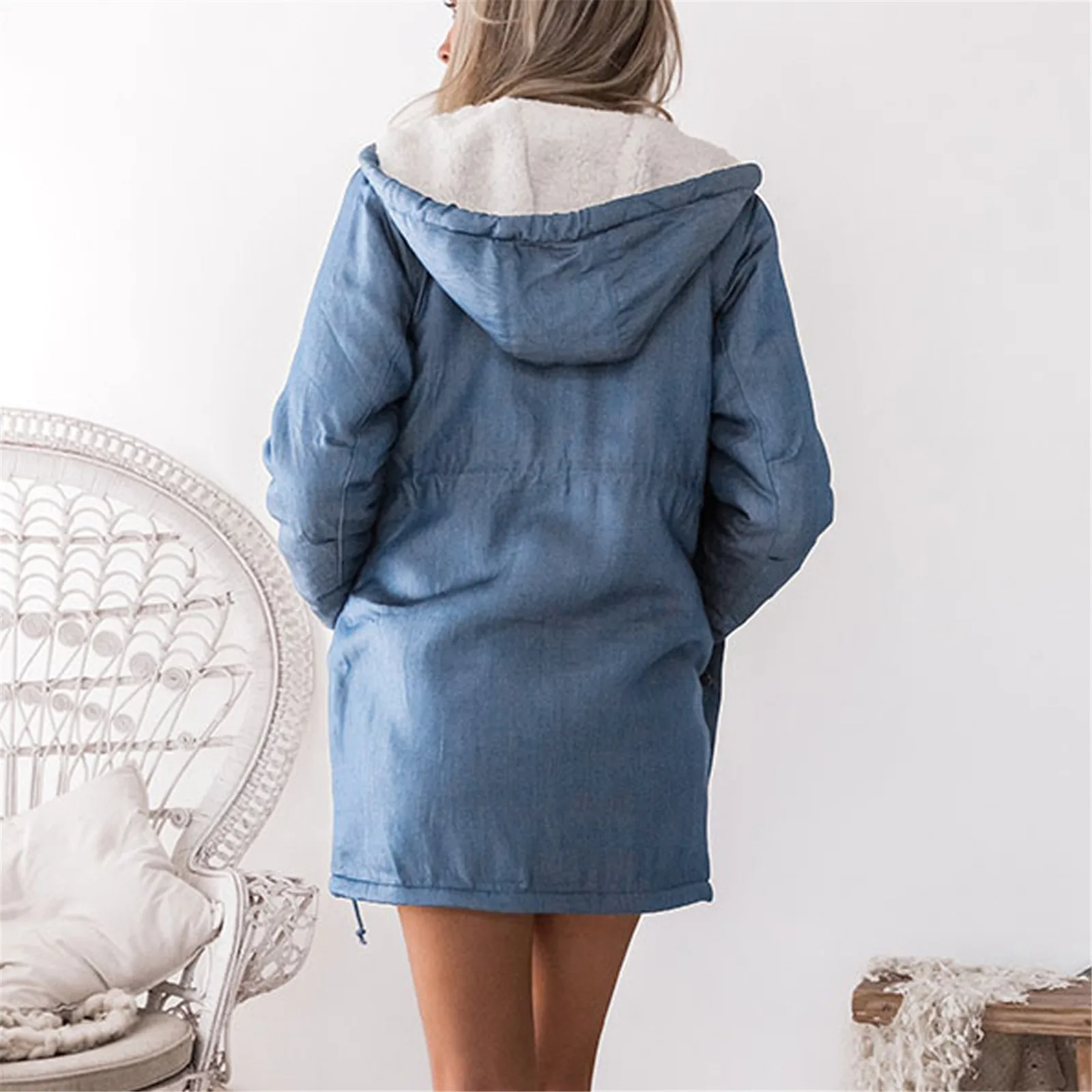 Женская Теплая Повседневная джинсовая куртка с капюшоном и длинным рукавом, длинное джинсовое пальто, верхняя одежда