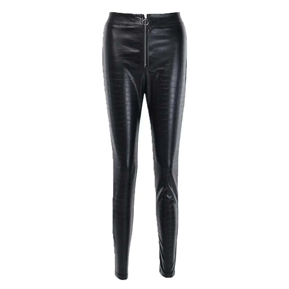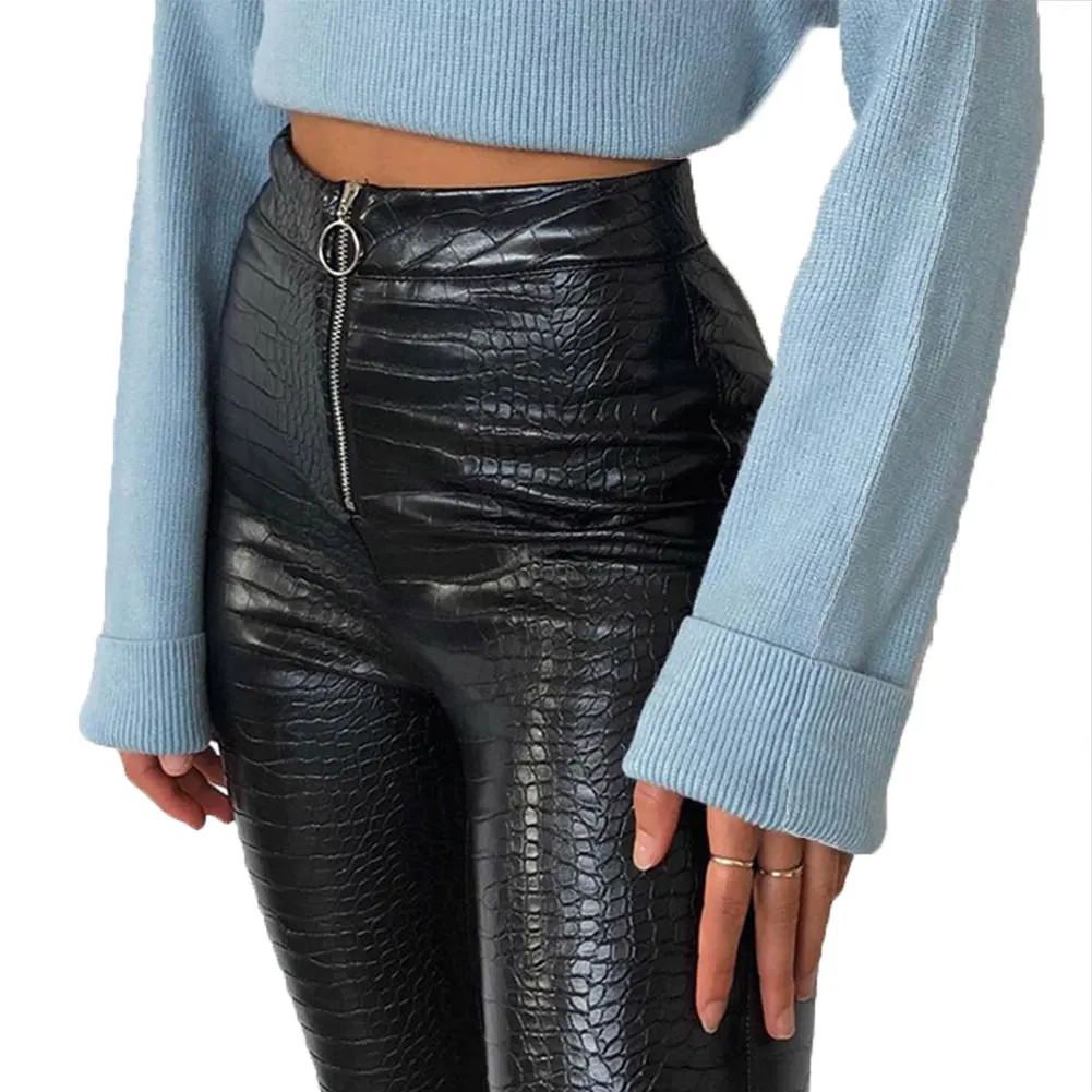 2020 Модные женские повседневные брюки из искусственной кожи с высокой талией Осень-зима брюки-карандаш с крокодиловым узором черные брюки на молнии