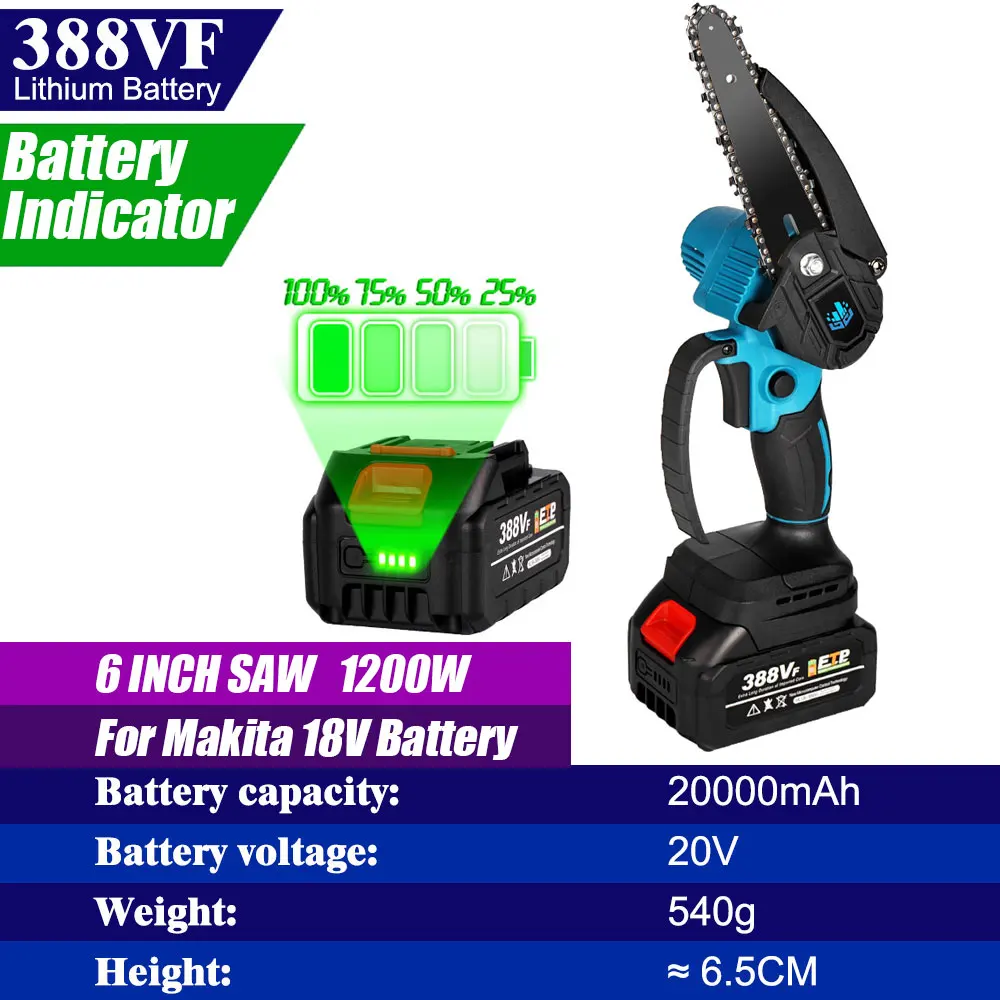 Зарядное устройство ЕС6-дюймовая бензопила:Мощность: 1200 ВтМатериал: АБС-пластик + металлДлина направляющей пластины: 6 дюймовСкорость холостого хода: 4000 об/минВес: 850 г(Батарея в комплект не входит!)Подходит для аккумулятора Makita 18VЛитиевая батарея 128VFНапряжение: 20 вЕмкость: 10000 амчВес: 320 гВысота: около 4,5 смЛитиевая батарея 388VFНапряжение: 20 вЕмкость: 20000 мАчВес: 540 гВысота: около 6,5 см100% увеличение времени работы аккумулятораЭффективность батареи 388VF на 30% выше, чем у обычной батареиОсобенность:Индикатор работы бензопилыБезопасный замок для бензопилы, Безопасный в использованииПерезаряжаемая Электрическая цепная пила светильник и портативная, с длительным сроком службы батареи, не повредит лаю.Нескользящая ручка с резиновым покрытием может храниться в течение длительного времени без усталости.Двигатель из чистой меди, высокая мощность, быстрая скорость резки, повышение эффективности.Высококачественный переключатель, регулировка скорости, плавное изменение скорости.Интеллектуальный плата управления цепью, защита от перегрузки, для удовлетворения различных потребностей в конструкции.Специальную направляющую пластину и шарик из вольфрамовой стали смазывать не нужно, поэтому машина может снизить сопротивление во время работы и снизить износ машины.Он компактный и может удерживаться одной рукой.Высококачественная направляющая цепь, глубокая закаленная, более износостойкая, гладкая резка.Посылка тация:Только 1 электрическая пилаИли1 электрическая пила + 1 * 128VFИли1 электрическая пила + 1 * 128VFИли1 электрическая пила + 1 * 388VFИли1 электрическая пила + 2 * 388VF