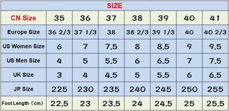 Это не европейский размер, Пожалуйста, выберите размер в соответствии с длиной Вашей стопы, согласно таблице размеров ниже. Если у вас широкая или Толстая стопа, выбирайте обувь большего размера.