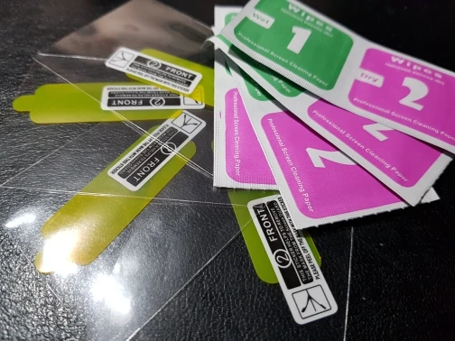 В комплекте 5 пленок, 5 спиртовых салфеток и 5 сухих салфеток. Пленка не закрывает края примерно на 1-1.5 миллиметра. Наклеилась нормально.