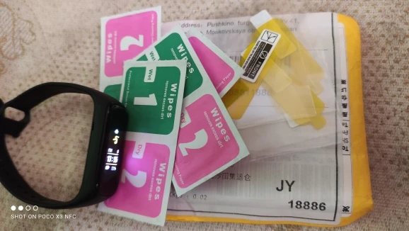 Плёнки шли очень долго, но все же приехали. В комплекте как и обещанно 5 шт + 5 наборов салфеток. Приклеить оказалось очень сложно из- за закругленных краёв экрана браслета и того, что сами плёнки не оч хорошего качества. Лучший результат что получила на фото. Из пяти пленок три направились в помойку. Одна всё- таки села на экран и одна осталась.