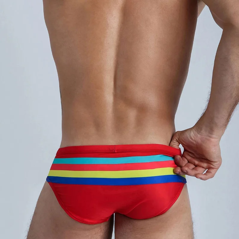 Сексуальные мужские купальные плавки бикини с радужной полоской, плавательные трусы для серфинга, быстросохнущие пляжные шорты, мужские спортивные купальные плавки для геев