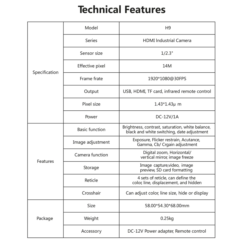 Спецификация:Серия: внутренняя камера HDMIРазмер сенсора: 1/2.3"Эффективный пиксель: 18 мРамка frate:1920*1080 @ 60FPSВыход: USB, HDMI, TF-карта, инфракрасный пульт дистанционного управленияРазмер пикселя: 1,43 * 1,43мкмМощность: DC-12V/1AОсобенности: базовая функция яркость, контраст, насыщенность, баланс белого, черно-белое переключение, регулировка датыРегулировка изображения: экспозиция, сдерживание мерцания, острота, гамма, регулировка Cb/ CrgainФункция цифровой зум камеры, Горизонтальное/вертикальное зеркало, замораживание изображенияХранение: захват изображений, видео, предварительный просмотр изображений, форматирование SD-картыСетка: 4 набора сетки, может определить цвет, линию, смещение и скрытыйПерекрещивание: можно регулировать цвет, размер линии, скрыть или отобразитьПоддерживаемые языки: китайский, английский, испанский, немецкий, португальский, французский, русский, итальянскийРазмер посылка: 58,00*54,30*68,00 ммВес: 0,25 кгАксессуар: адаптер питания DC-12V, пульт дистанционного управления