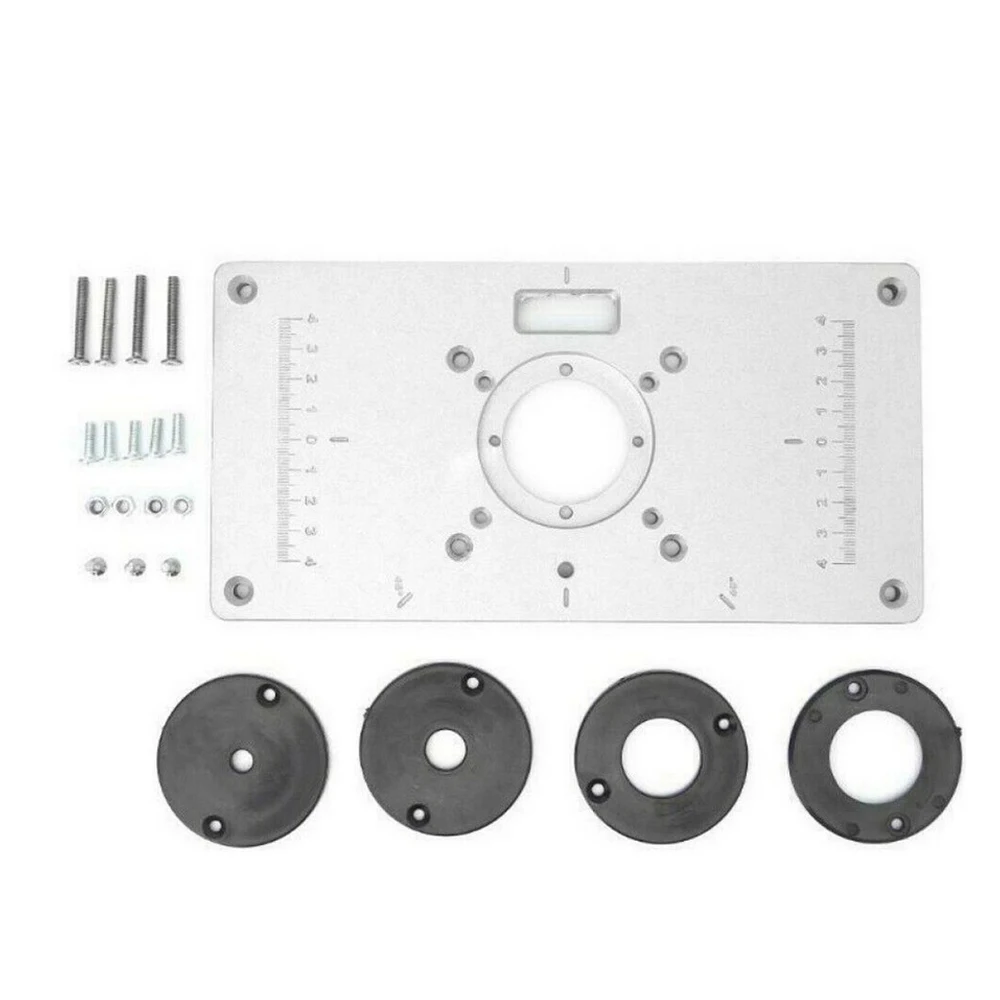 Особенности:Изготовлен из алюминиевого сплава, он практичен в использовании и не легко ржавеет.Удобная Втулка с центральным отверстием, используемая для выравнивания маршрутизатора, поэтому она центрируется в отверстии для бит.Точно сверлить и устанавливать любой маршрутизатор легко.Он прост в использовании и делает работу хорошо выполненной. Технические характеристики:Материал: пластина из алюминиевого сплава, пластмассовые кольцаТип: с 4 красными кольца со вставками, с 4 черными кольца со вставками (опционально)Размеры: прибл. 235*110*8 мм/9,3*4,7 * 0.3inРасстояние отверстия: около 62*70 мм/2,44*2,76 дюймаВес: 450 г/0,99lbРазмер посылка: 250*130*40 мм/9,8*5,1*1,6 дюймовВес посылка: 520 г/фунтов Посылка список:1 * Пластина для вставки стола маршрутизатора4 * маршрутизатор кольца со вставками1 * упаковка крепежных винтов