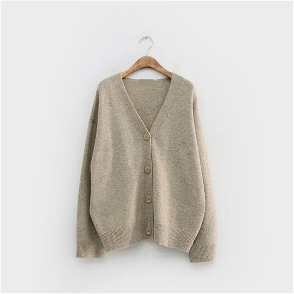Женский винтажный кардиган с V-образным вырезом, повседневный простой однотонный вязаный жакет из мягкого хлопка в Корейском стиле, осень 2020