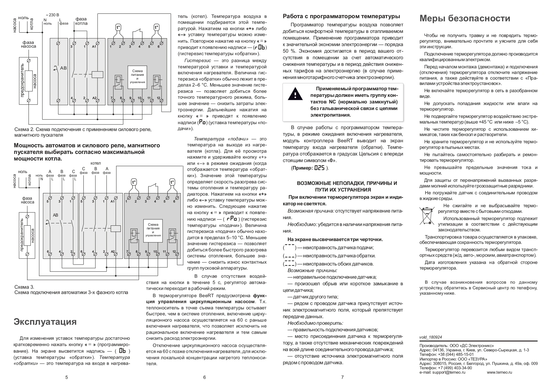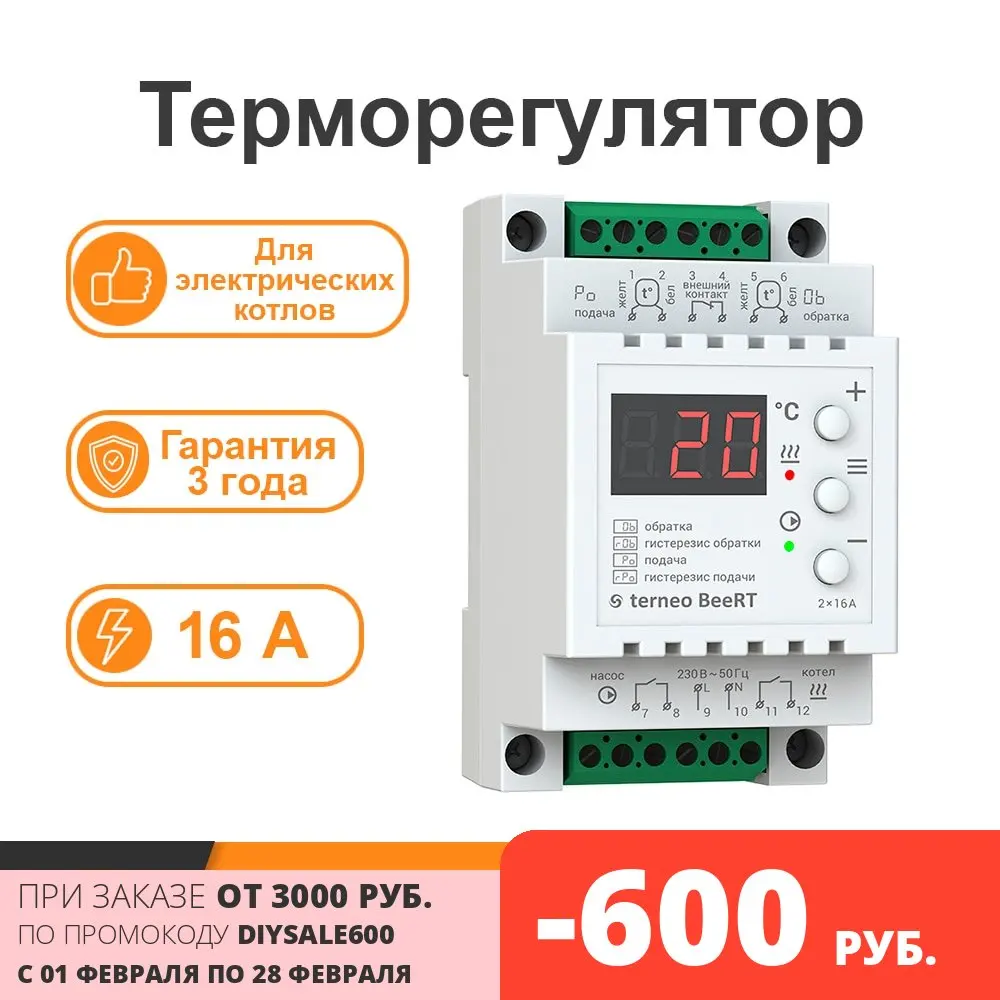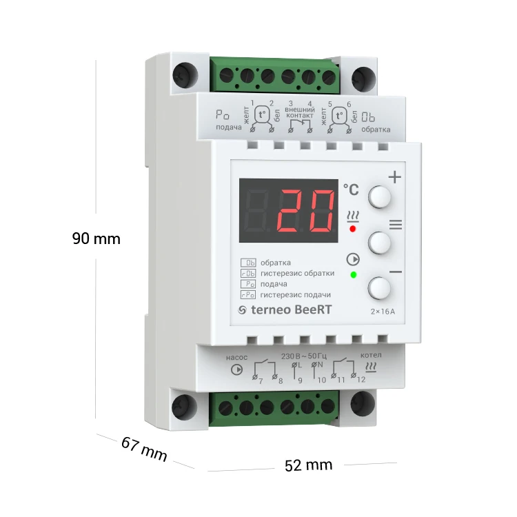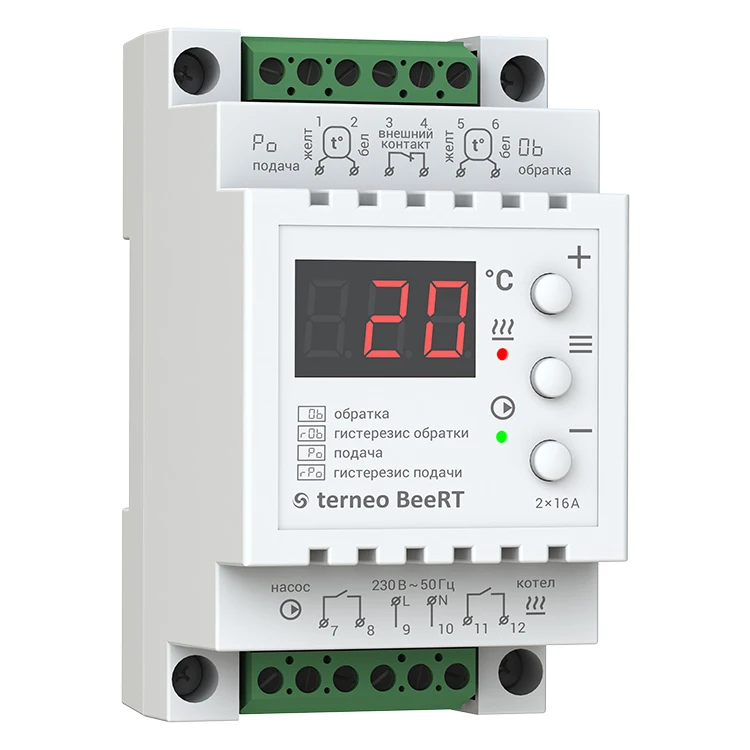 Эффективное управление электрокотлом с terneo BeeRTТерморегулятор предназначен для контроля работы ТЭНовых и электродных котлов. Идеальный вариант для модернизации старых моделей котлов и автоматизации их работы. Терморегулятор позволяет поддерживать температуру теплоносителя в пределах от 5 до 85 °С. Он обеспечивает оптимальную работу котла и циркуляционного насоса благодаря регулированию температуры в подающем и обратном трубопроводах. Ограничив максимальную температуру теплоносителя в трубопроводе на выходе из котла, вы можете предотвратить получение ожогов кожи людей.Широкий спектр заданийТерморегулятор terneo BeeRT позволяет управлять нагревом электрического котла. Кроме того, он оптимизирует и контролирует работу циркуляционного насоса, благодаря чему защищает котел и систему трубопроводов от перегрева.При условии подключения к устройству внешнего программатора можно регулировать нагрев теплоносителя, отталкиваясь от температуры воздуха. Так можно достичь комфортных условий в помещении и оптимизировать расходы электроэнергии на обогрев.Терморегулятор имеет широкий температурный гистерезис (от 1 до 30 °С). Вы можете настроить диапазон поддерживаемой температуры, тем самым уменьшить частоту включений нагрева. Это способствует продлению срока службы терморегулятора.Удобство в управленииНастройка работы терморегулятора осуществляется только тремя кнопками. Благодаря энергонезависимой памяти параметры работы сохраняются даже при перебоях в подаче электроэнергии.Наличие цифрового экрана упрощает навигацию в меню. На нем отображаются системные уведомления и значение температуры.Легкий монтажВсе, что необходимо для монтажа — в комплекте! Установка устройства происходит в щиток на стандартную DIN-рейку шириной 35 мм.