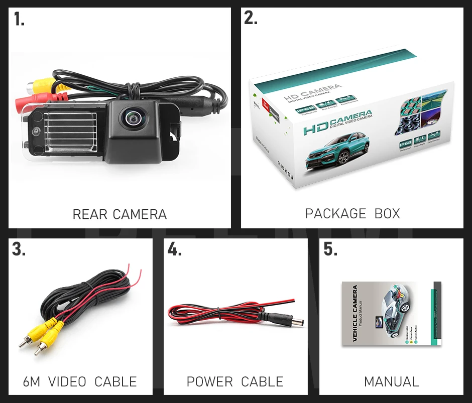 1. Задняя камера2. Коробка для посылка3. Видео кабель (6 м)4. Кабель питания5. Руководство пользователя