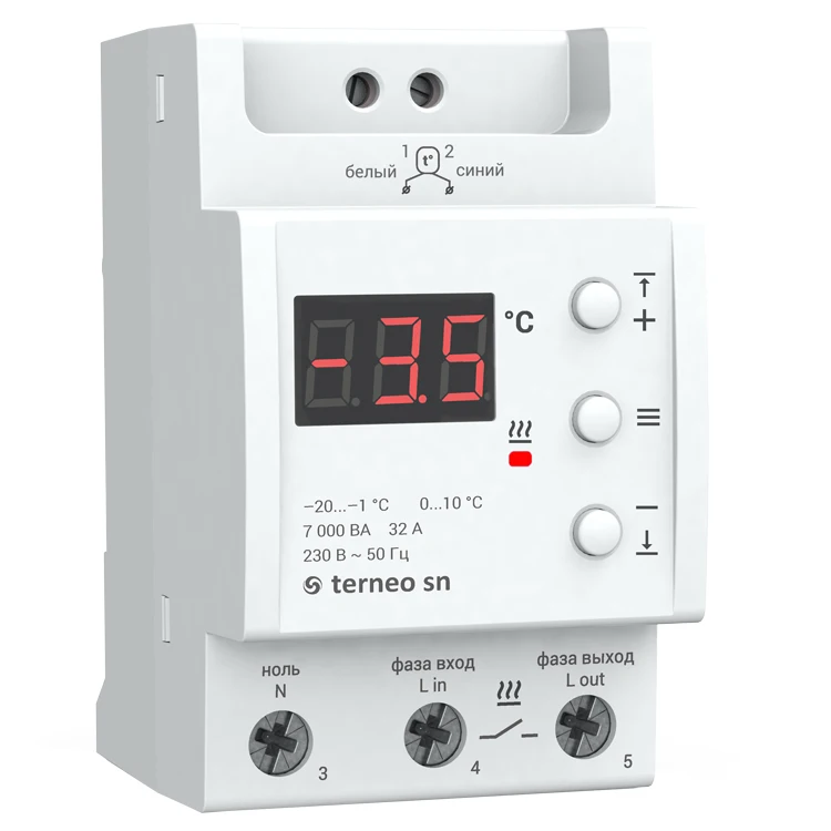 С terneo sn безопасно зимойТерморегулятор предназначен для работы с системами антиобледенения и снеготаяния повышенной мощности (до 6000 ВА). Обеспечивает оптимальную работу благодаря возможности настраивать диапазон температуры, при котором возможно намерзание сосулек на крыше или образование гололедицы на земле. Вы не расходуете зря электроэнергию, когда температура за окном слишком низкая или достаточная для природного таяния.Удобство в управленииНастройка работы терморегулятора осуществляется с помощью всего лишь трех кнопок! Цифровой экран отображает температуру и системные уведомления, а также упрощает навигацию в меню.Легкий монтажВ комплект входят терморегулятор и датчик температуры с соединительным проводом. Устройство монтируется в щиток на стандартную DIN-рейку шириной 35 мм, а датчик температуры располагается снаружи дома в месте, где на него не будут попадать прямые солнечные лучи и осадки.Защита от перегреваЕсли температура внутри корпуса достигнет 80°С, устройство отключится. На экране 1 р / с будет высвечиваться «oht». Для возобновления работы температура должна снизится до 60 °С. Если защита сработает более 5 раз: терморегулятор отключится до тех пор, пока температура не снизится 60 °С и не будет нажата одна из кнопок.Универсальный терморегуляторВы можете применять его с нагревательными кабелями большинства производителей. Устройство может работать с аналоговыми (R10) или цифровыми (D18) датчиками.