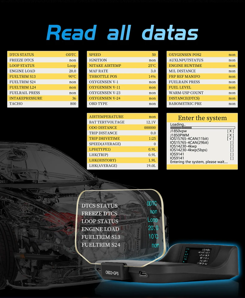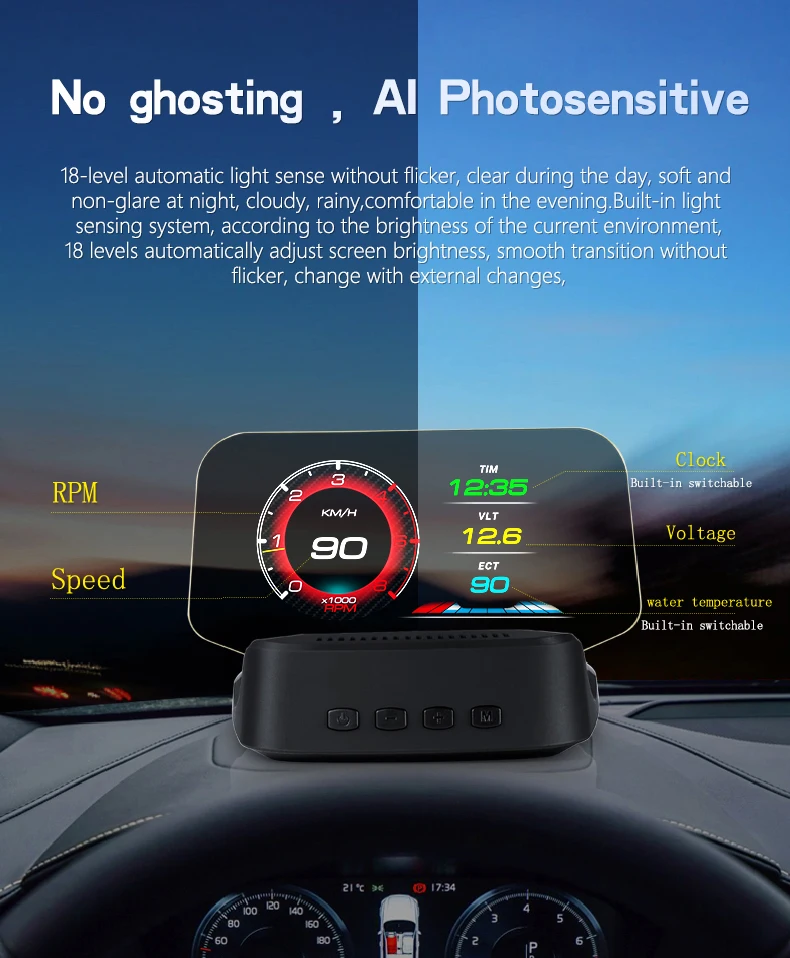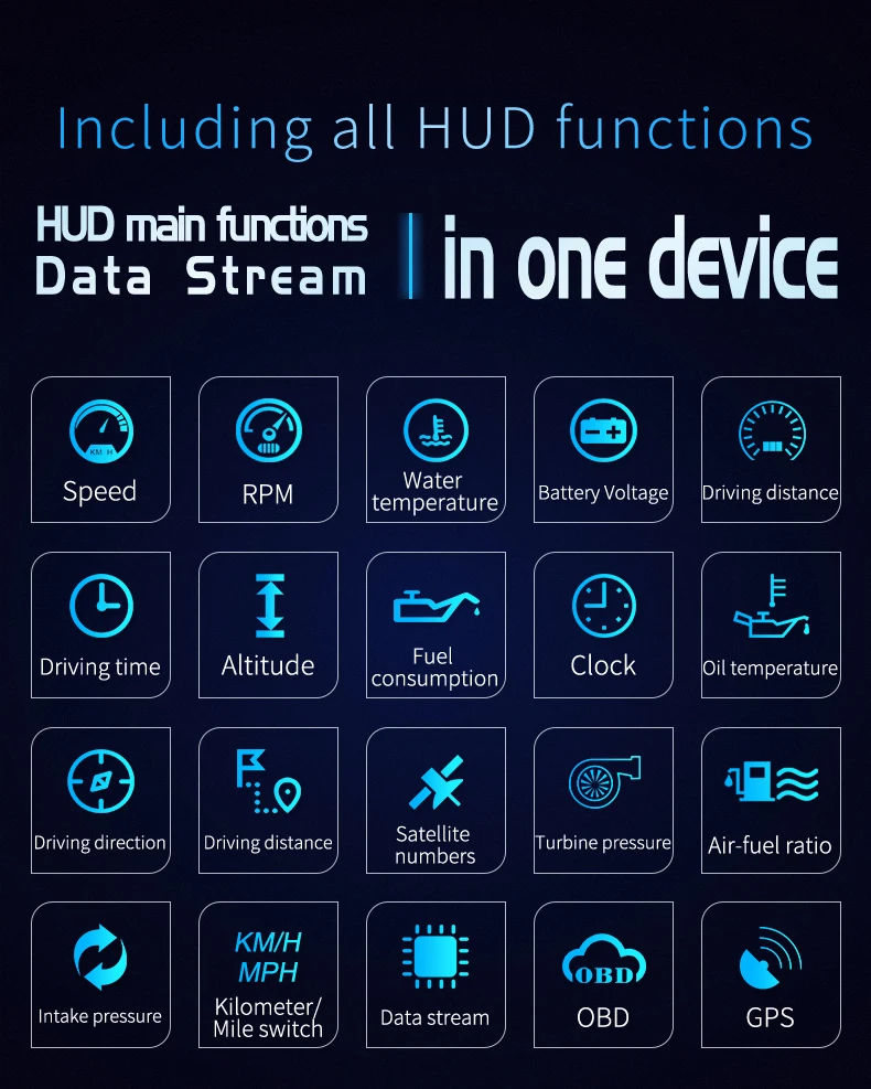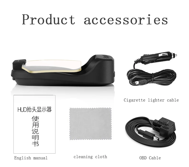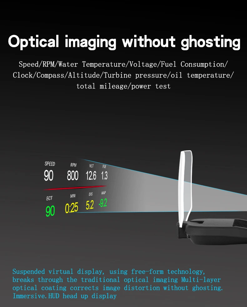 Название продукта: бортовой дисплей, автомобильный общий OBD HD навигационный проектор, Weiying Интеллектуальный HUD Дисплей Особенности продукта: Функция режима OBD: скорость транспортного средства, температура воды, напряжение, расход топлива, скорость вращения, один пробег, общий пробег, совокупное время в пути, направление движения, номер звезды, высота, системное время, давление впуска, температура масла, соотношение воздуха и топлива, давление турбины, давление впуска, испытание на ускорение, испытание на тормоз, Четкий код неисправности, считывание потока данных Сигнализация: сигнализация с превышением скорости, сигнализация скорости, сигнализация с температурой воды, сигнализация с напряжением, сигнализация с неисправностью двигателя Функция режима GPS: скорость, время в пути, Спутниковое время, высота, количество сателлитов, направление движения, одно расстояние, испытание на ускорение напряжения, испытание на тормоз Сигнал тревоги: слишком низкое напряжение сигнала тревоги Как использовать навигацию: Загрузите приложение WiiYii, HUD и смартфон для беспроводного подключения по bluetooth и синхронизируйте навигационную информацию через приложение