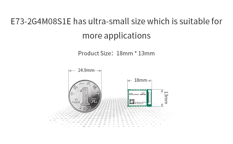 [Введение]:E73-2G4M08S1E-это малогабаритный, маломощный многопротокол модуль, разработанный Ebyte. Он принимает оригинальный импортный радиочастотный чип nRF52833 из Северной Европы, поддерживает Bluetooth 5,1, Ble mesh, Thread, Zigbee; Этот чип поставляется с высокопроизводительным сердечником ARM CORTEX-M4.