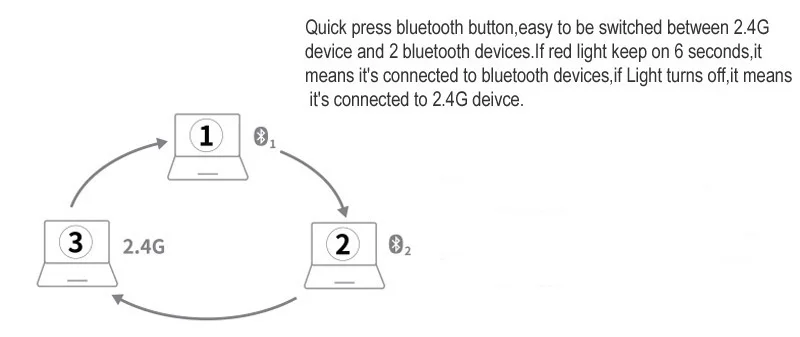 Переключение между Bluetooth 3,0, 4,0 и 2,4 ГГцУмный переключатель между Bluetooth 3,0, 4,0 и 2,4 GHz обеспечивает стабильную беспроводную передачу. Вы все еще можете использовать комбо независимо от нехватки usb-порта или потери приемника.