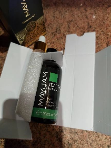 Viene muy bien presentado y es tal cual se ve en la foto. Lo único que no huele como el árbo de té que yo había olido en otro aceite.