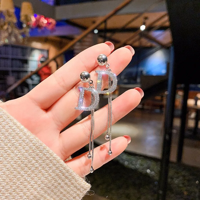 Женские серьги-подвески с буквами D, на длинной цепочке, с кристаллом, эффектные свадебные украшения, серьги-подвески большого размера