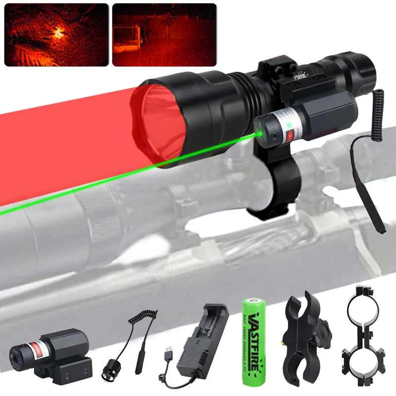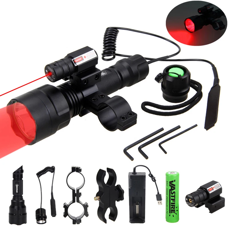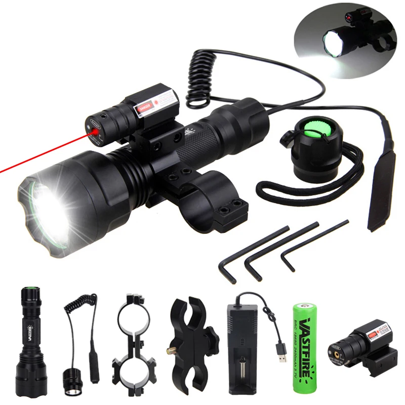Тактисветильник охотничья вспышка C8 XM-L, фонарь для разведки винтовки + лазерный точечный прицел + переключатель + 2*20 мм рельсовое крепление + 18650 + зарядное устройство