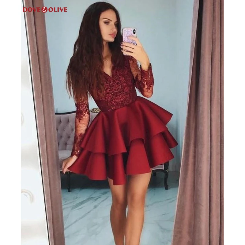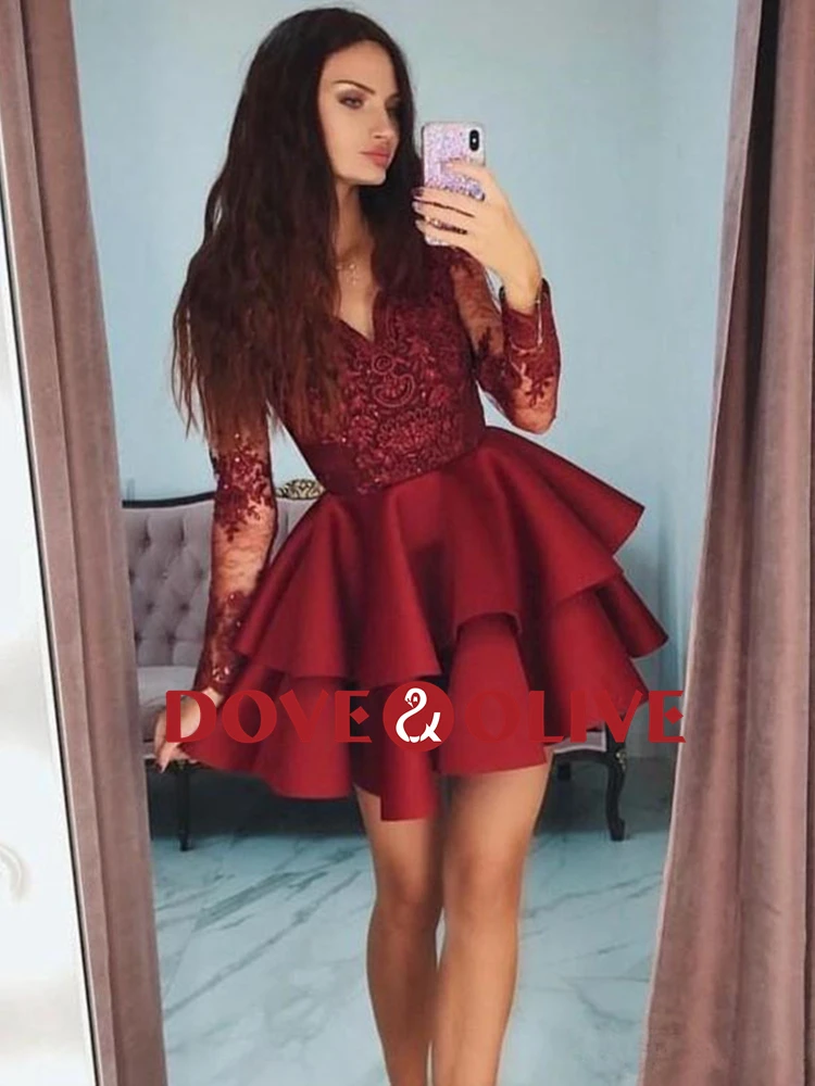 Бордовое платье-трапеция с V-образным вырезом и коротким коктейльные платья Аппликация, с длинными рукавами и бусинами, атласное Многоярусное вечернее платье