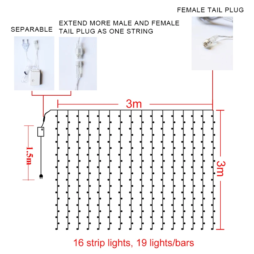 Светодиодный цвет: теплый белыйНапряжение: 220 ВКоличество СВЕТОДИОДНЫЙ: 960 светодиодный SВилка: ЕС (220 В)Материал: ПП, ТПР и CR-V стальВодонепроницаемый светодиодный занавес: IP44Водонепроницаемый разъем: IP20 (если вам нужно использовать его снаружи, пожалуйста, сделайте некоторую защиту для вилки)Провод от вилки до контроллера: 1,5 мРазмер гирлянды: 3 м * 1 м/6 м * 1 м/9 м * 1 м/12 м * 2 м и т. д.Посылка-включает в себя:1 шт. x 220 в EU светодиодный наружный домашний Рождественский Декоративный Рождественский гирлянда для штор гирлянды вечерние гирлянды для штор