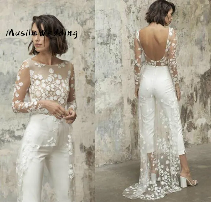 Сексуальный комбинезон с открытой спиной свадебное платье es Illusion с длинным рукавом Кружевное пляжное свадебное платье Boho скромное 2020 дешевые брюки поезд для невесты