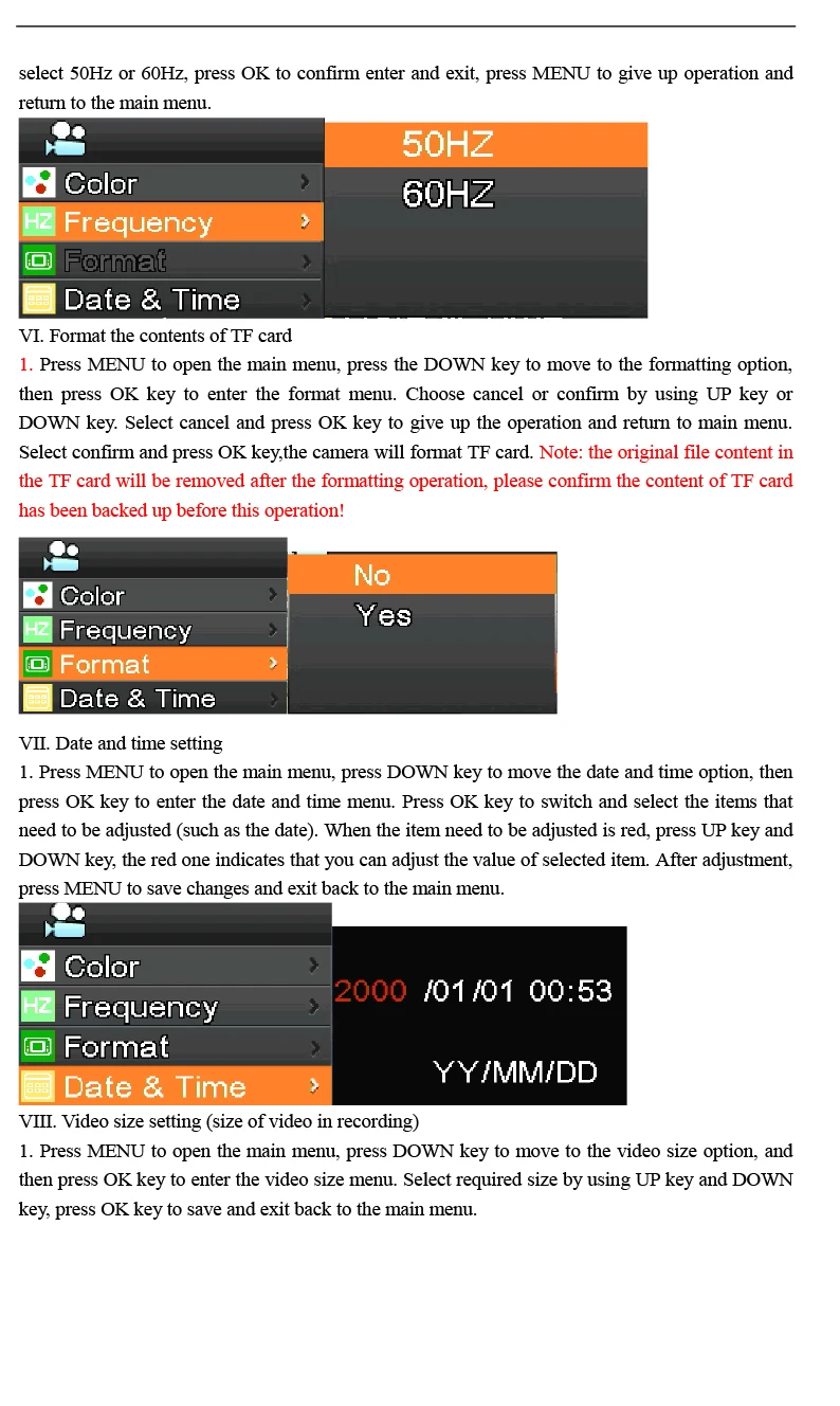 Размер фильма: 4K(55fps) 2K(25fps) 1080P(60fps) 720P(60fps)(Примечание: Если вам нужно записать видео 4K или 2K, вам необходимо использовать TF-карту SDHC class10.)