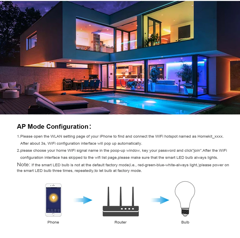 A) не требуется концентратор для настройки: немедленно Начните управлять своей лампой с помощью быстрой и легкой настройки с помощью Wi-Fi на совместимом устройстве Apple iOS с приложением Apple Home.Б) Голосовое управление с Siri: Управляйте светом с помощью голосовой интеграции через Siri попросите Siri затемнить свет, установить сцену, включить или выключить и многое другое.C) работает с Apple HomeKit для поддержки более 16 миллионов доступных цветов и регулируемой температуры белого цвета от 2700K до 6500K. Не требуется концентратор для установки.D) он работает с Apple HomeKit, поэтому вы можете легко управлять подключенными лампами с помощью Siri на вашем iPhone, iPad, iPod touch или Apple Watch. Не требуется устанавливать другие приложения.Советы -- приложениеБудьте уверены в том, что вы используете 2,4 ГГц Wi-Fi при подключении к смарт-лампы. И Wi-Fi должен быть обнаружен статус. Многие роутеры имеют Wi-Fi 5 ГГц и 2,4 ГГц сети и ваш телефон всегда будет автоматически подключится к Wi-Fi 5 ГГц сети. Таким образом, вы должны полностью отключить свою сеть 5 ГГц, перейдя к настройкам маршрутизатора (введите ip-адрес маршрутизатора в Ваш Интернет-браузер, как правило, что-то похожее на 192.168.1.1), заставляя вашего телефона для подключения к 2,4 ГГц сети.Кроме того, режим шифрования маршрутизатора должен быть WPA2-PSK типом, а тип аутентификации должен быть AES.Световое решение без рук