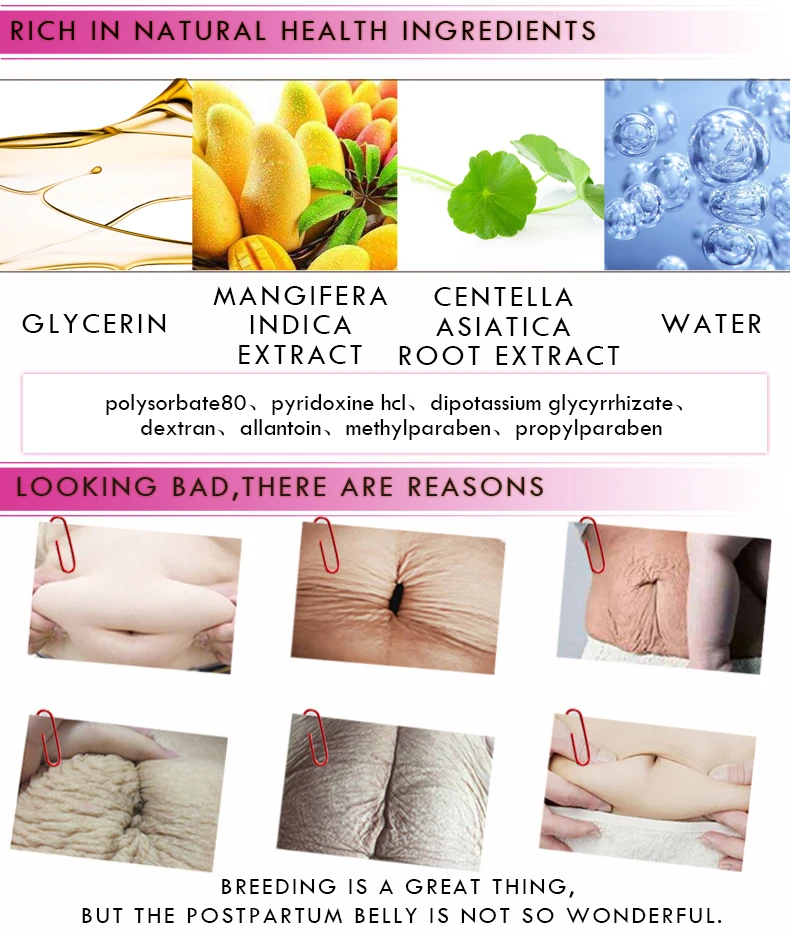 Разработанный для растяжек мамы до и после родов, содержит эссенцию манго и различные ингредиенты для восстановления растительного питания, которые легко впитывают кожу, уменьшение растяжек и линий ожирения, вызванных беременностью, способствует регенерации клеток и повышает эластичность кожи. Кожа выглядит мягче и мягче. Три коробки курса лечения.