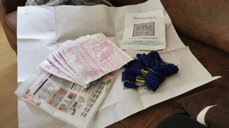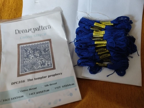 Ниток достаточно много, хотя цвет слишком ярко-синий, хотелось бы поприглушеннее, канва обработана по краям, но она чрезвычайно жёсткая, я не смогла заправить ее ни в какие пяльца. Так что засунула в стиральную машину, посмотрим, станет ли помягче. Схема на двухсторонних листах, бликует и пахнет, но я нашла электронную схему. Иголки две штуки, слишком узкие для этих ниток, я буду брать побольше, брала набор вообще посмотреть, как это выглядит. Пока не очень. Конечно, ничего суперского не ожидаешь, но всё же можно было чуть поприятнее сделать. Но пришло быстро, трек отслеживался. Спасибо.