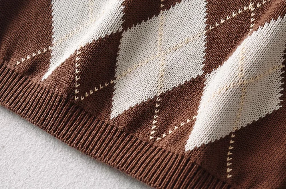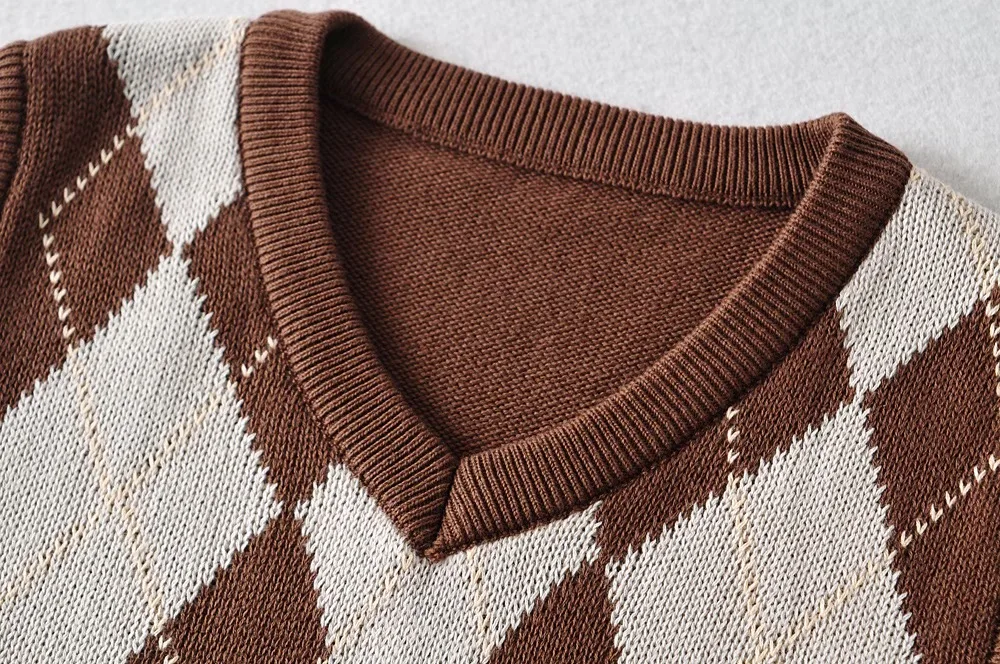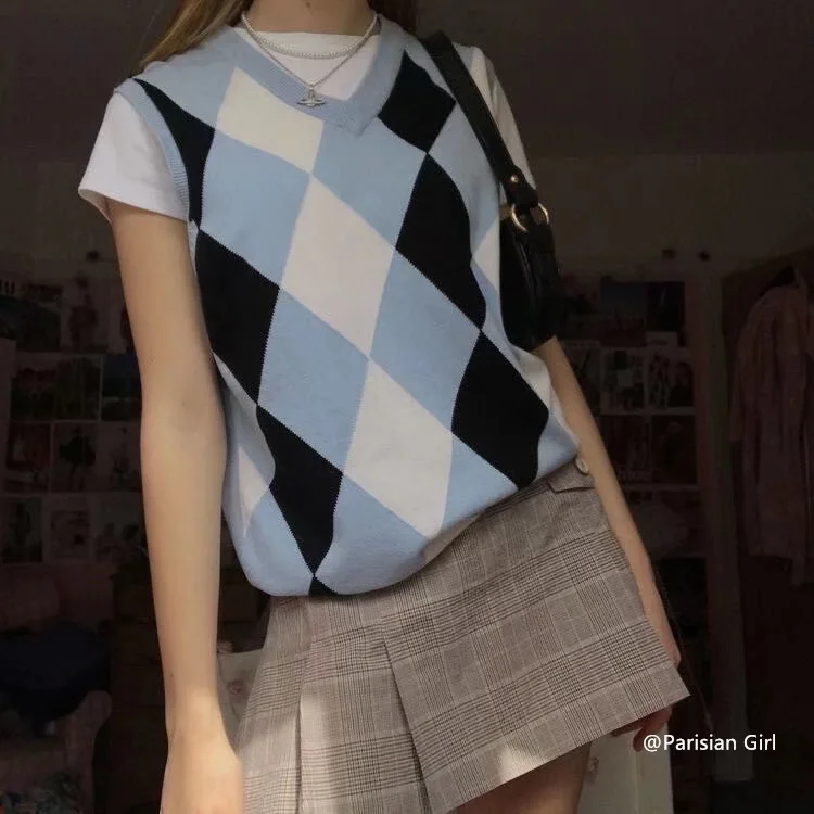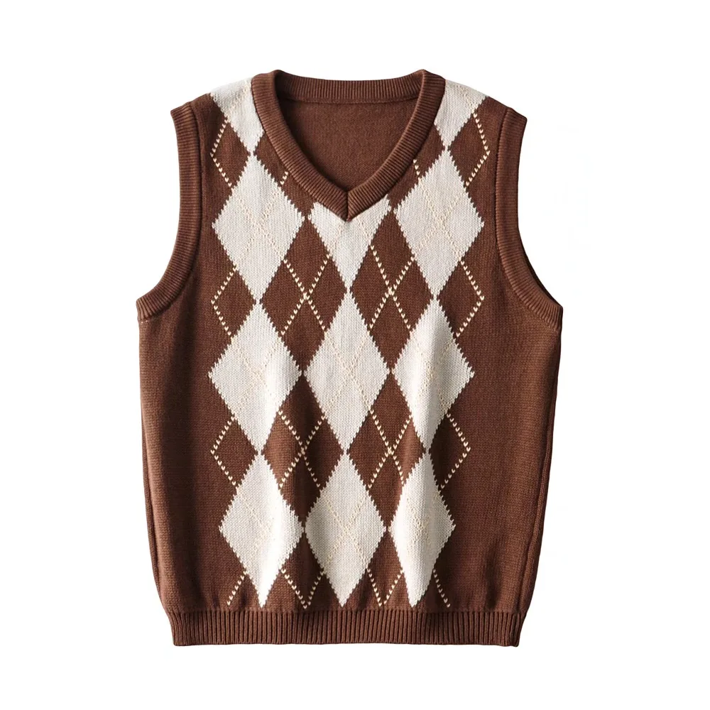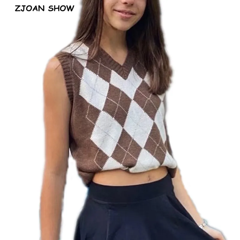 Вязаный свитер-жилет в шотландскую клетку в стиле 90-х, бежевого и зеленого цветов, Классный джемпер без рукавов с V-образным вырезом в Корейском стиле, Y2K, вязаная одежда