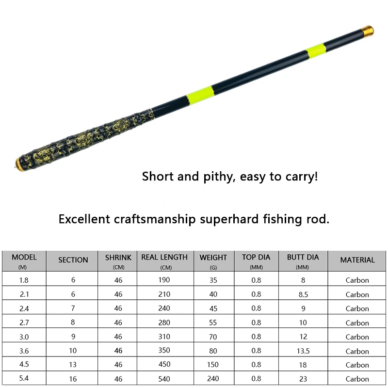 Углеродная рыболовная портативная телескопическая удочка 1,8 м, 2,1 м, 2,4 м, 2,7 м, 3,0 м, 3,6 м, 4,5 м, 5,4 м, ручная удочка для речной ловли карпа, спиннинговое удилище