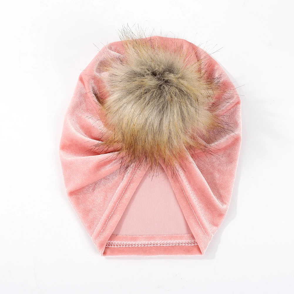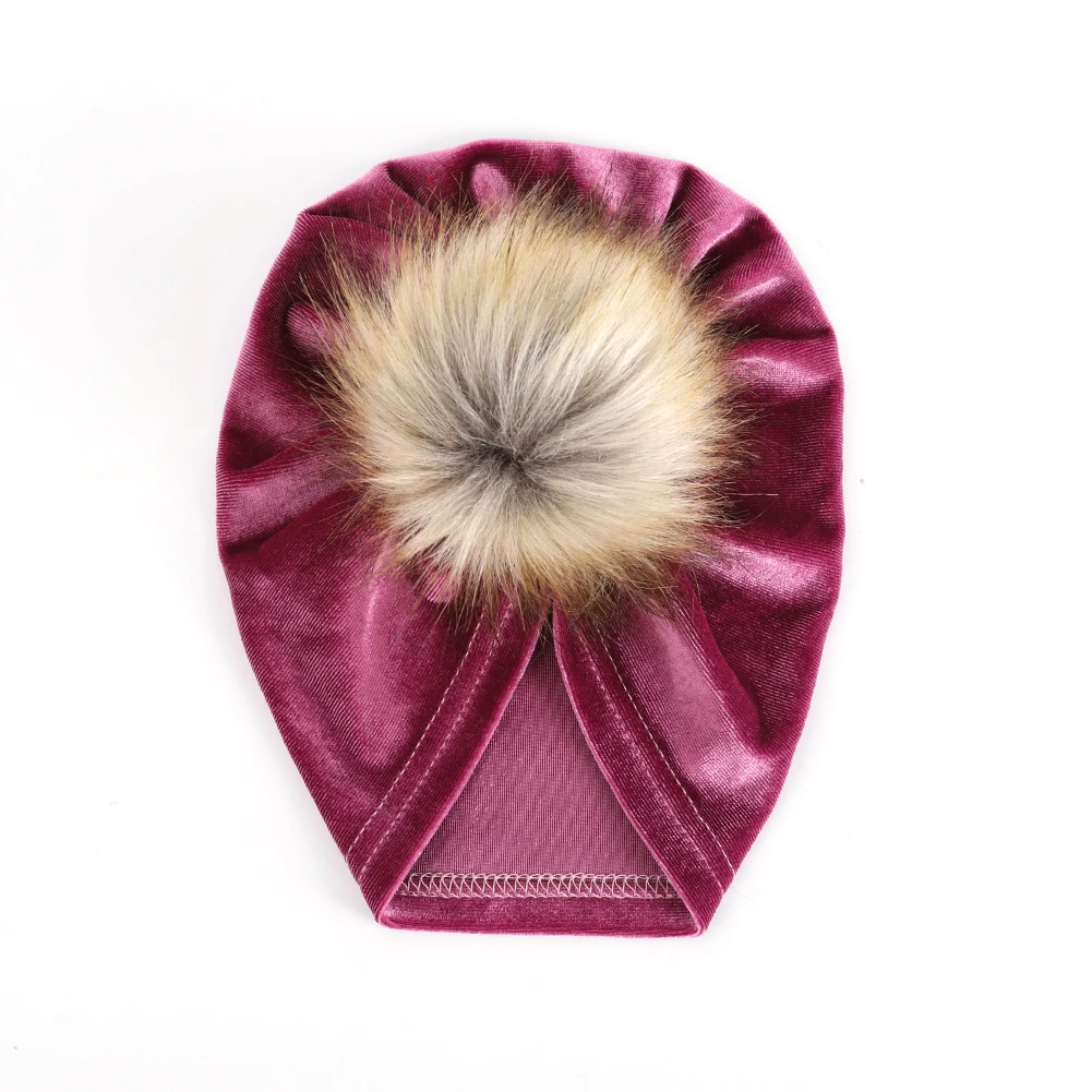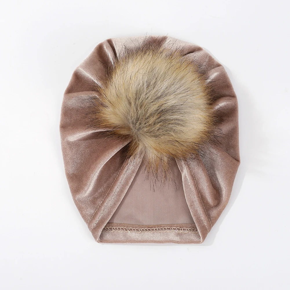 Шапка с меховым помпоном для мальчиков и девочек, однотонная Теплая Шапка-бини из бархатной ткани с большим помпоном на осень и зиму