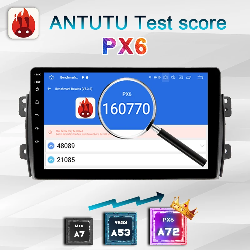 PX6PX6 является лучшим чипом на рынке в настоящее время, он работает быстрее, чем все другие типы. Балл ANTUTU составляет 160770, что лучше 9853 4G + 64G, PX5 и всех других типов 4 + 64G на рынке. По сравнению с другими радио типа fo, PX6 radio может загружать больше видов приложений android с android market, и приложение может работать лучше.