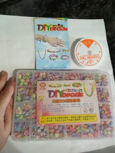 Очень порадовал набор, яркие бусины, много лески, в комплекте есть ножницы и заклепки для ободка и застежки для брошей и колье. В целом ребенок доволен