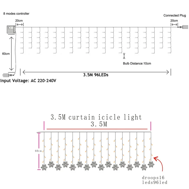 Посылка включает в себя:1 х светодиодный светильник для занавесок со снежинками