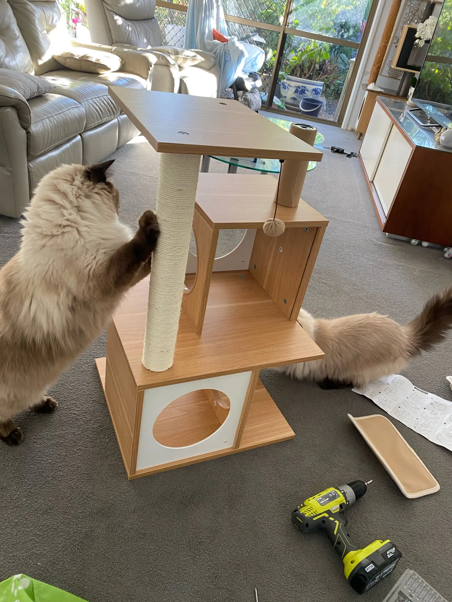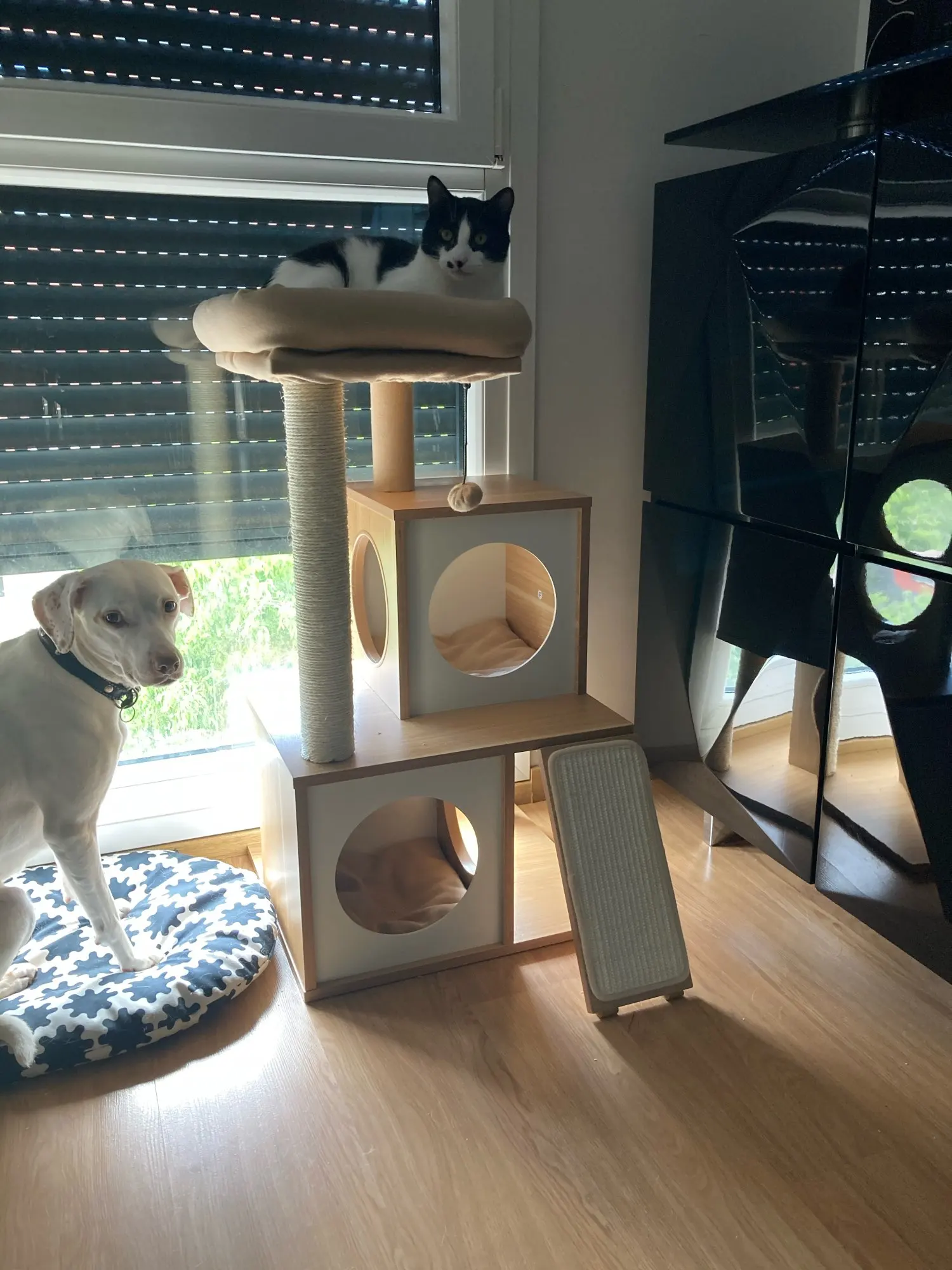 Материал высокого качества-Высокая плотность шпона, гладкая и прочная. 2 удобные подушкиВнутри дома кошки и 3 Противоскользящих мата на ступеньках съемные иМашинная стирка. Его тяжелый вес, утолщенная Нижняя пластина делает егоБолее стабильный, чем другие.