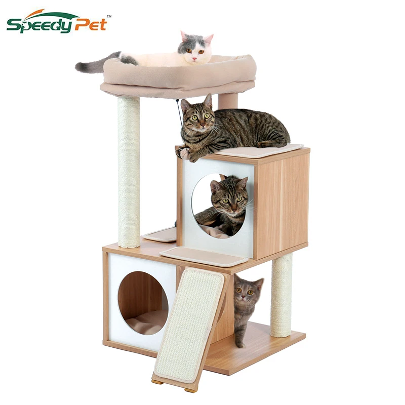 4. Модный и новый дизайн, верхнее гнездо достаточно просторное. Колонна сизаля покрыта полукруглым гнездом, который мягкий и удобный. ВМаленький дом в средней части красивый и щедрый, с хорошим видом. Рама для скалолазания кошки роскошная и красивая в целом, она может использоваться одновременно несколькими кошками.