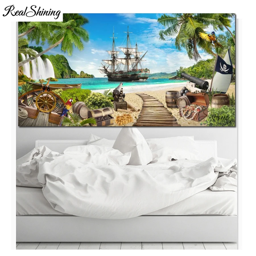 Алмазная живопись с изображением пиратской лодки, Приморского берега, водопада, деревьев, полноразмерная вышивка, натуральная искусственная вышивка крестиком F643