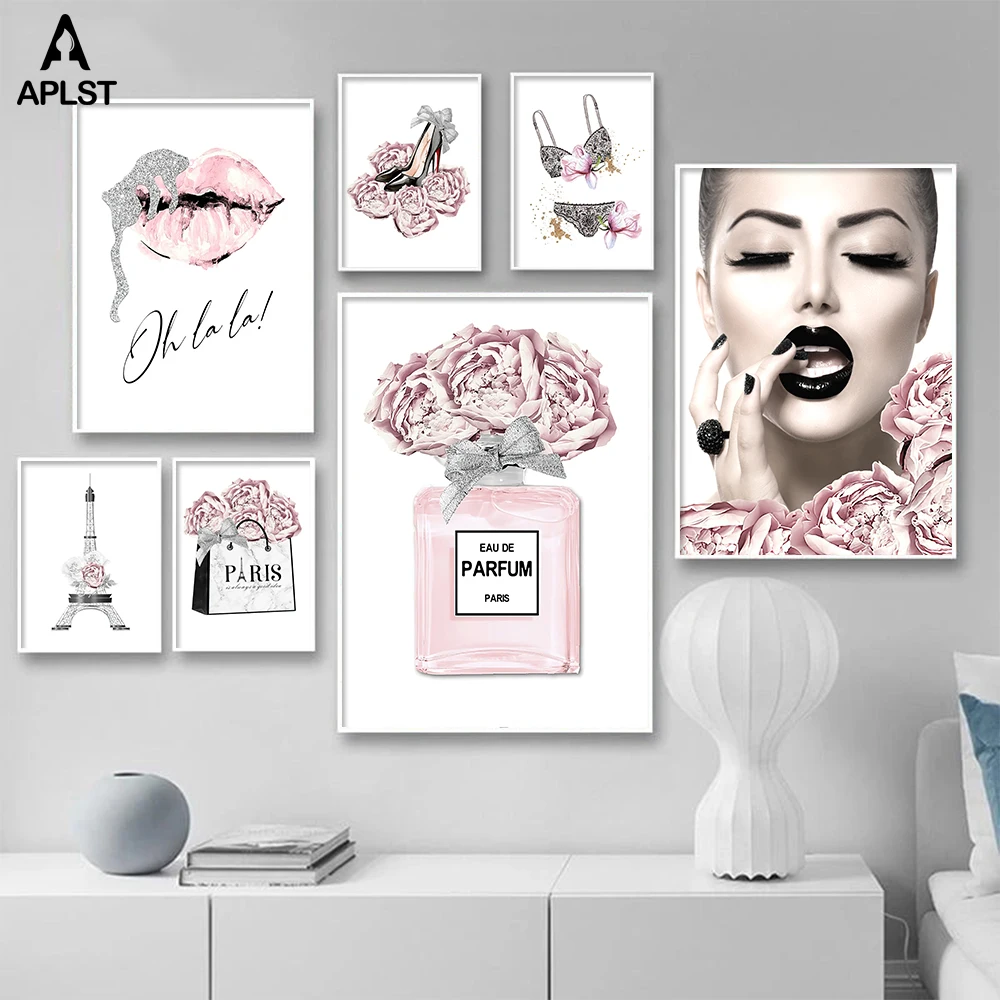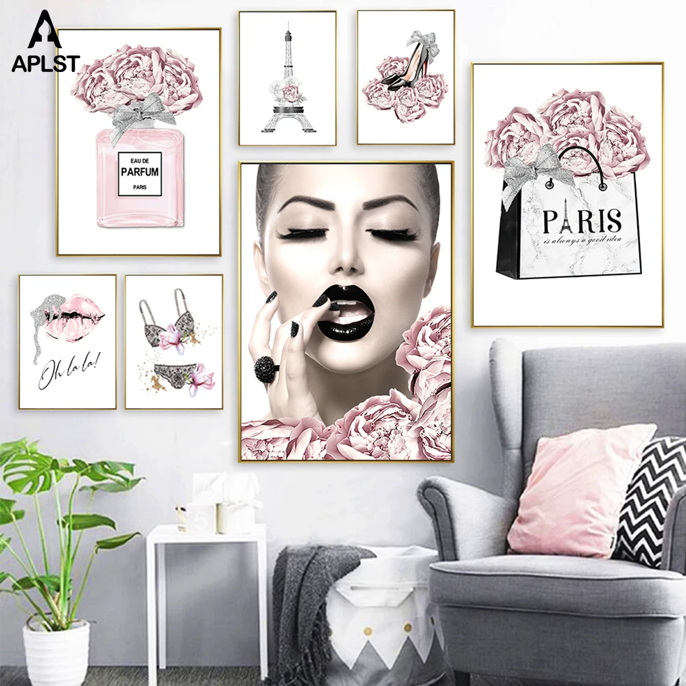 Женская мода макияж ресницы цветок парфюм бюстгальтер холст печать сексуальная леди губы стена искусство плакат на высоких каблуках Картина декор