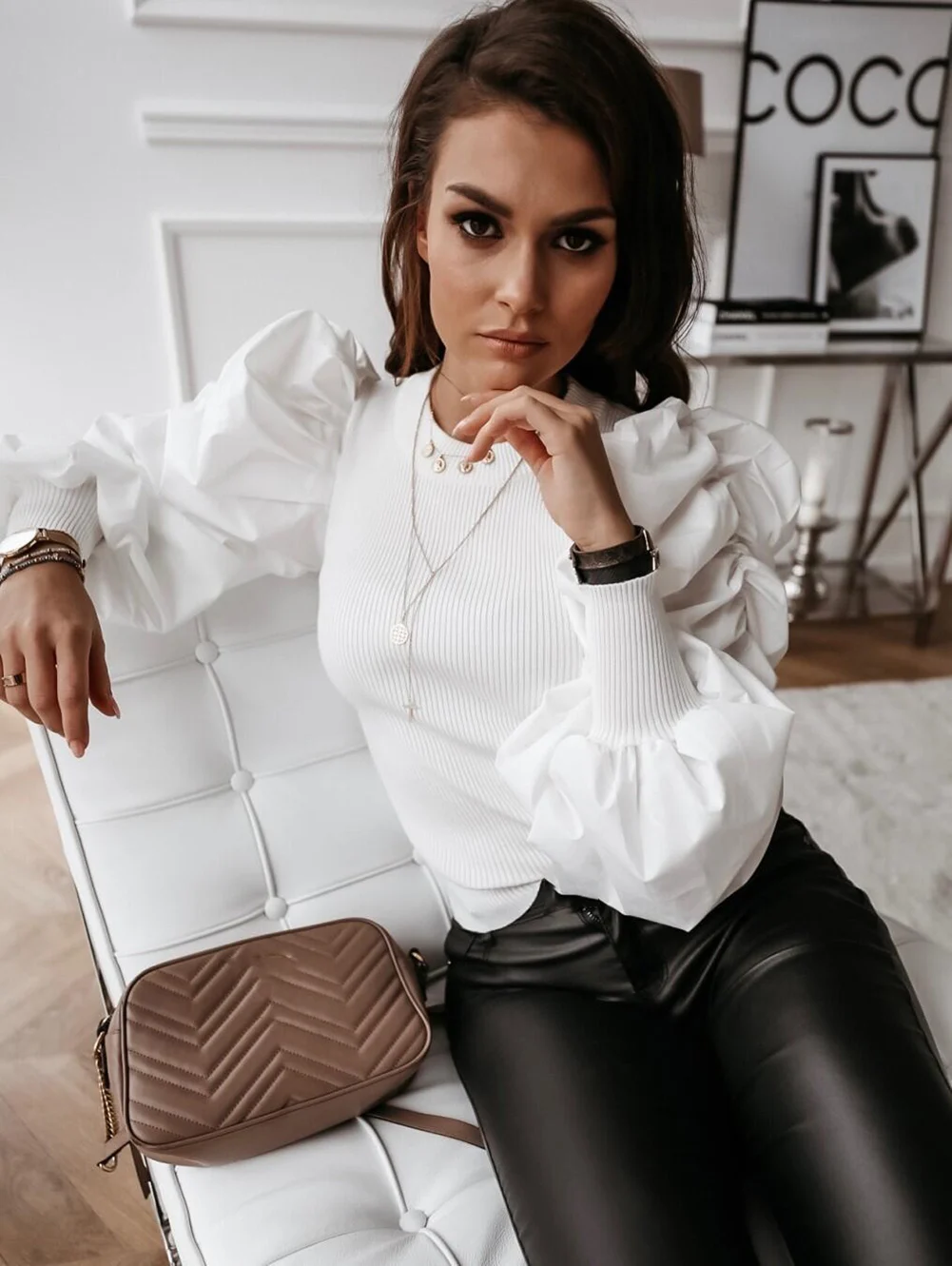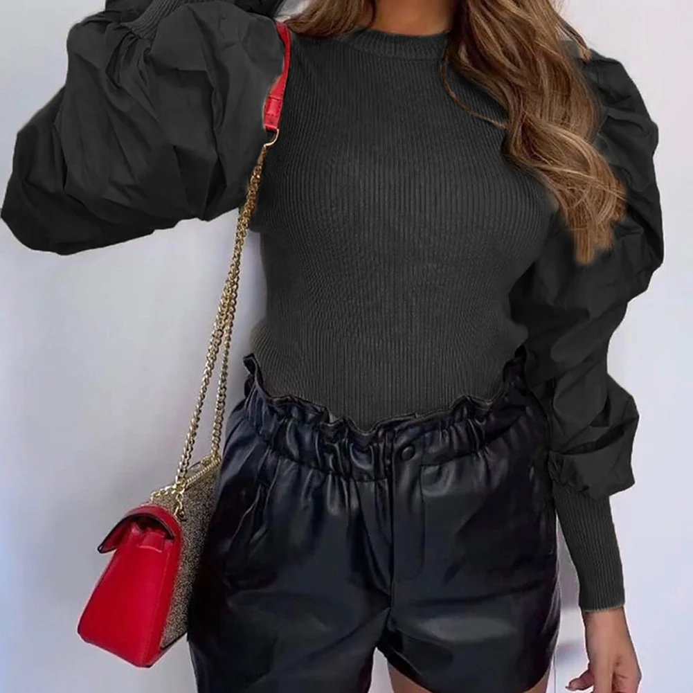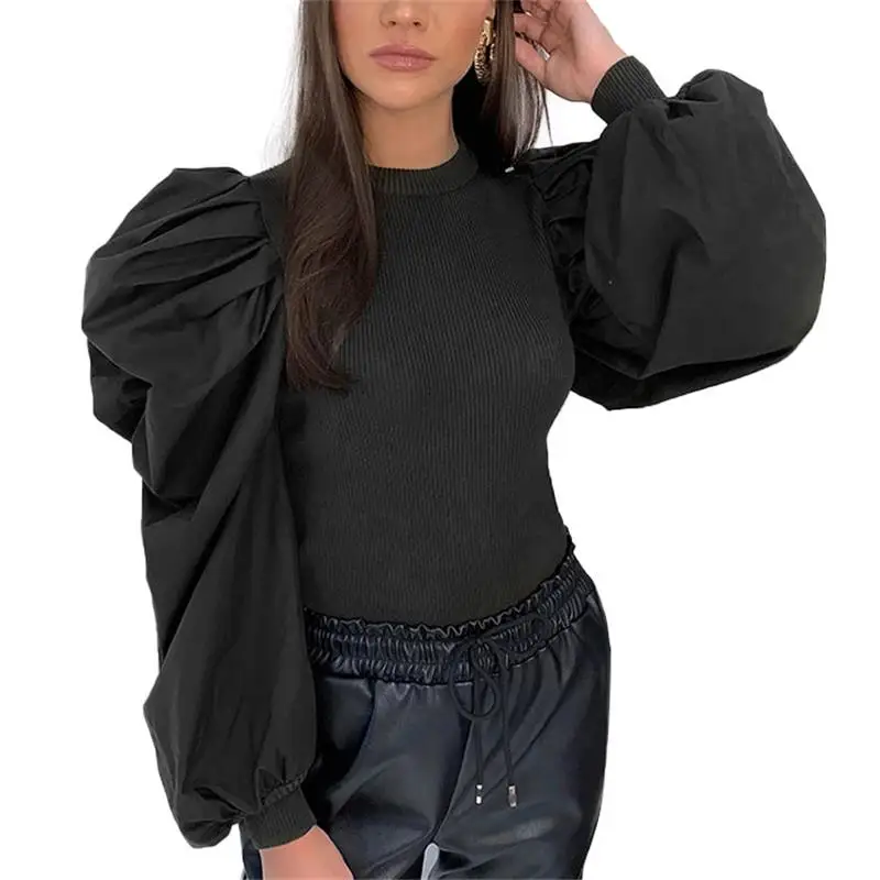 Женская трикотажная блузка с длинным рукавом-фонариком, осень-весна