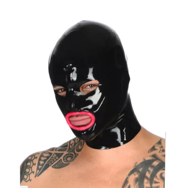 Черная латексная маска-капюшон ручной работы с открытыми большими г...