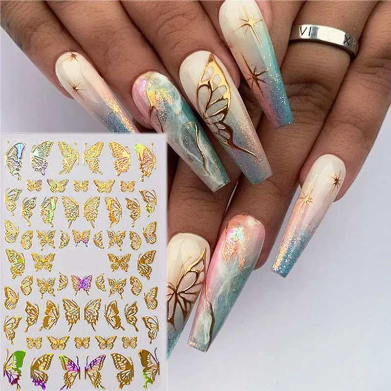 8 шт.компл. 3D лазерные наклейки для дизайна ногтей цветные золотые серебряные фольга переводные наклейки бабочки украшения для ногтей клейкие слайдеры