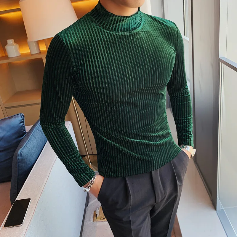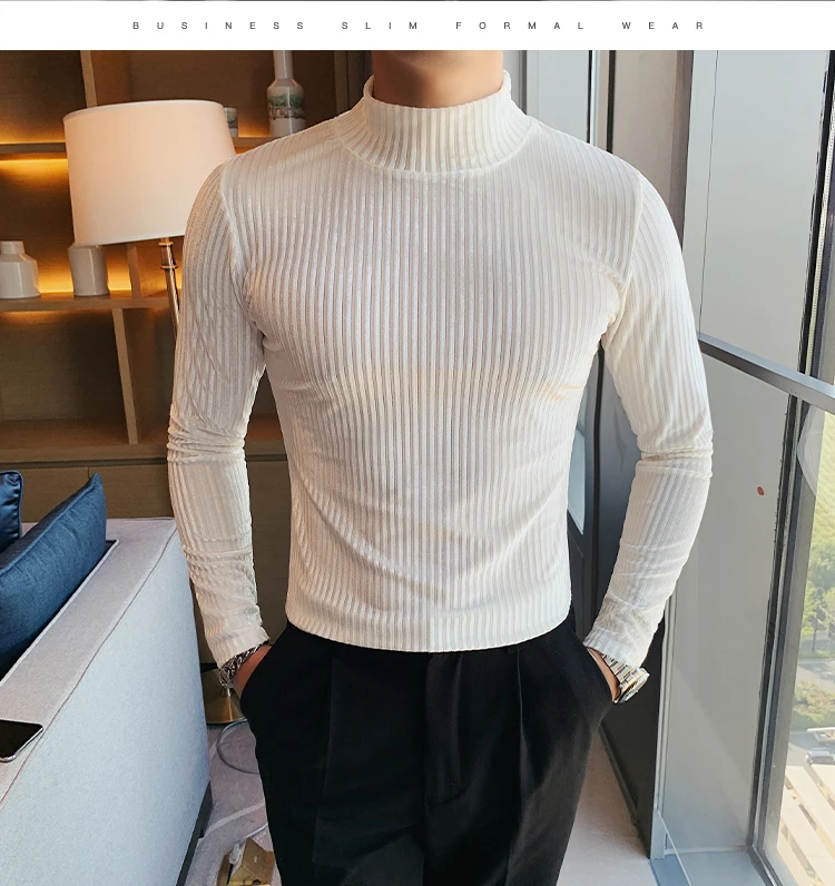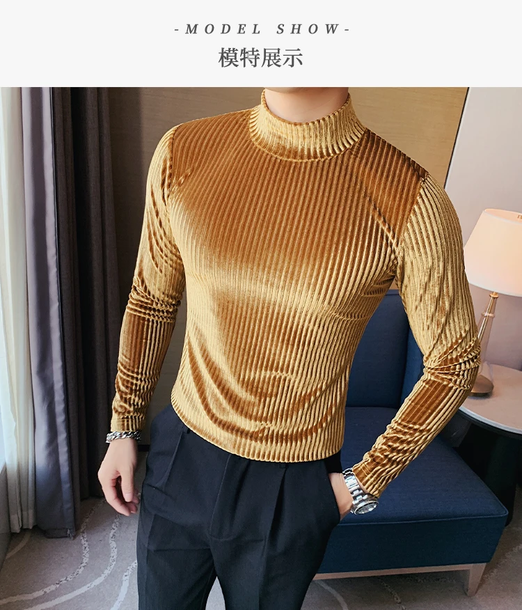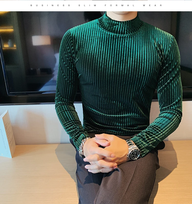 Зеленые бархатные мужские футболки с воротником-стойкой 2020, полосатая Вельветовая желтая футболка, приталенные черные базовые рубашки, черная блузка, Белый Топ